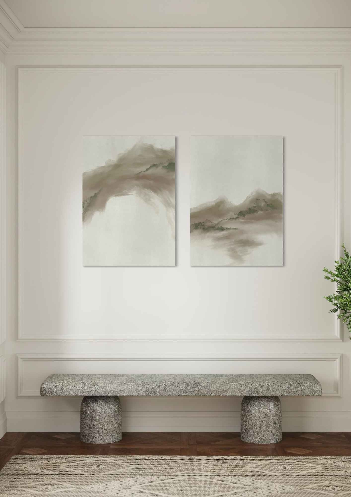 צמד ציורים מופשטים ומלאי רוך המתארים נוף הררי עדין בגוונים טבעיים של בז’, חום וירקרק מעושן, המשתלבים יחד לכדי תחושת שקט והרמוניה.