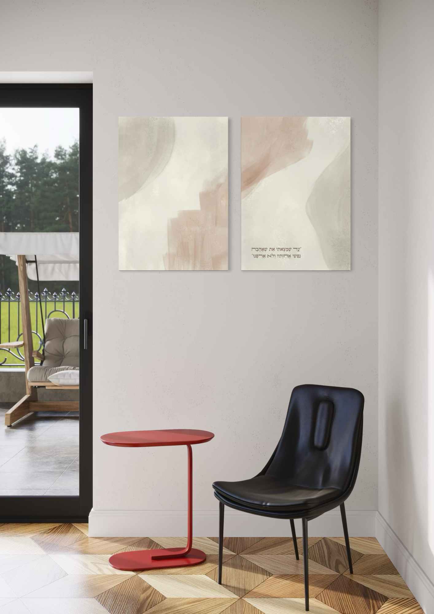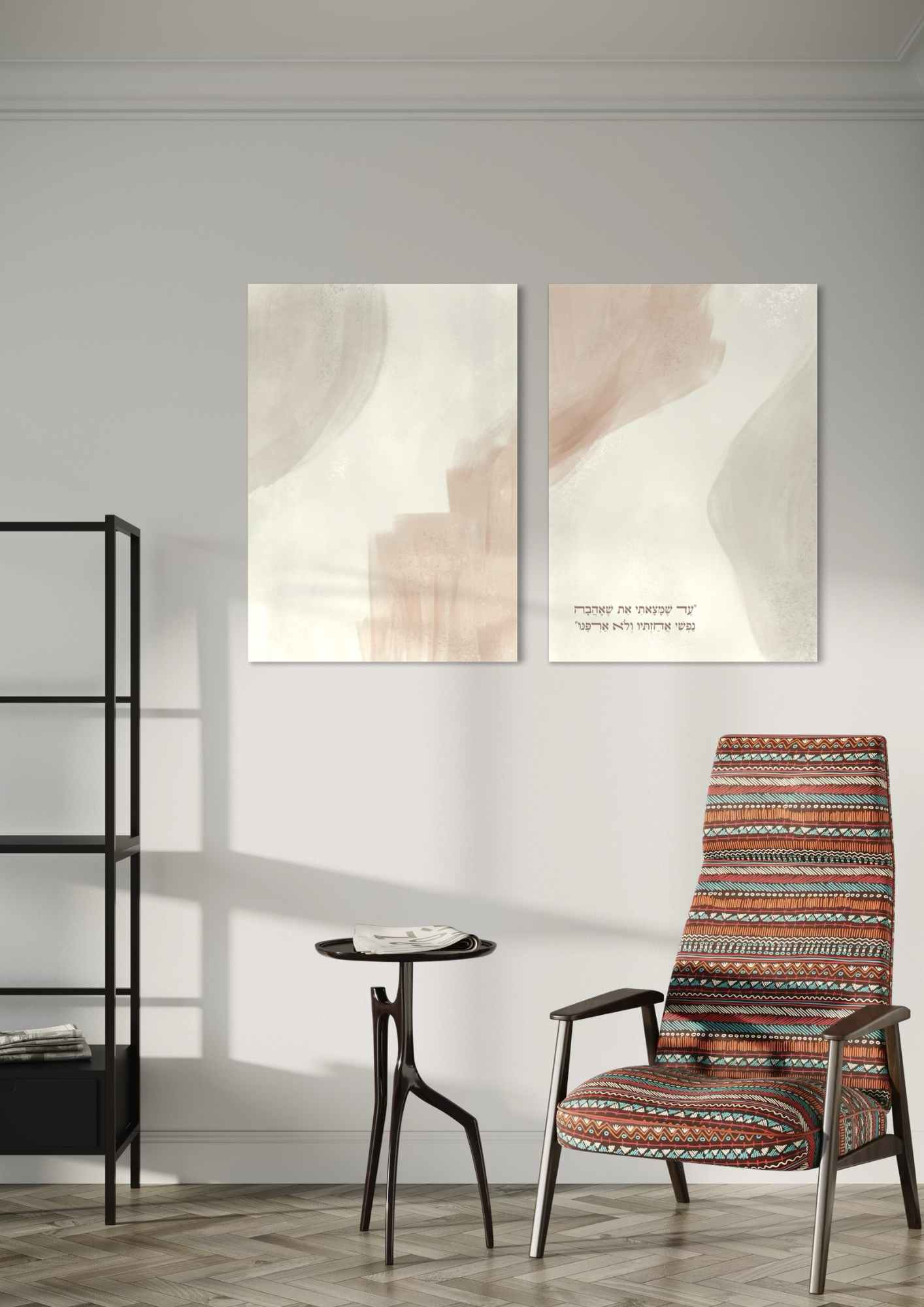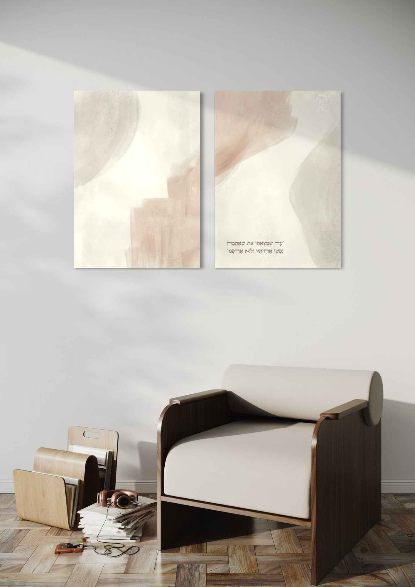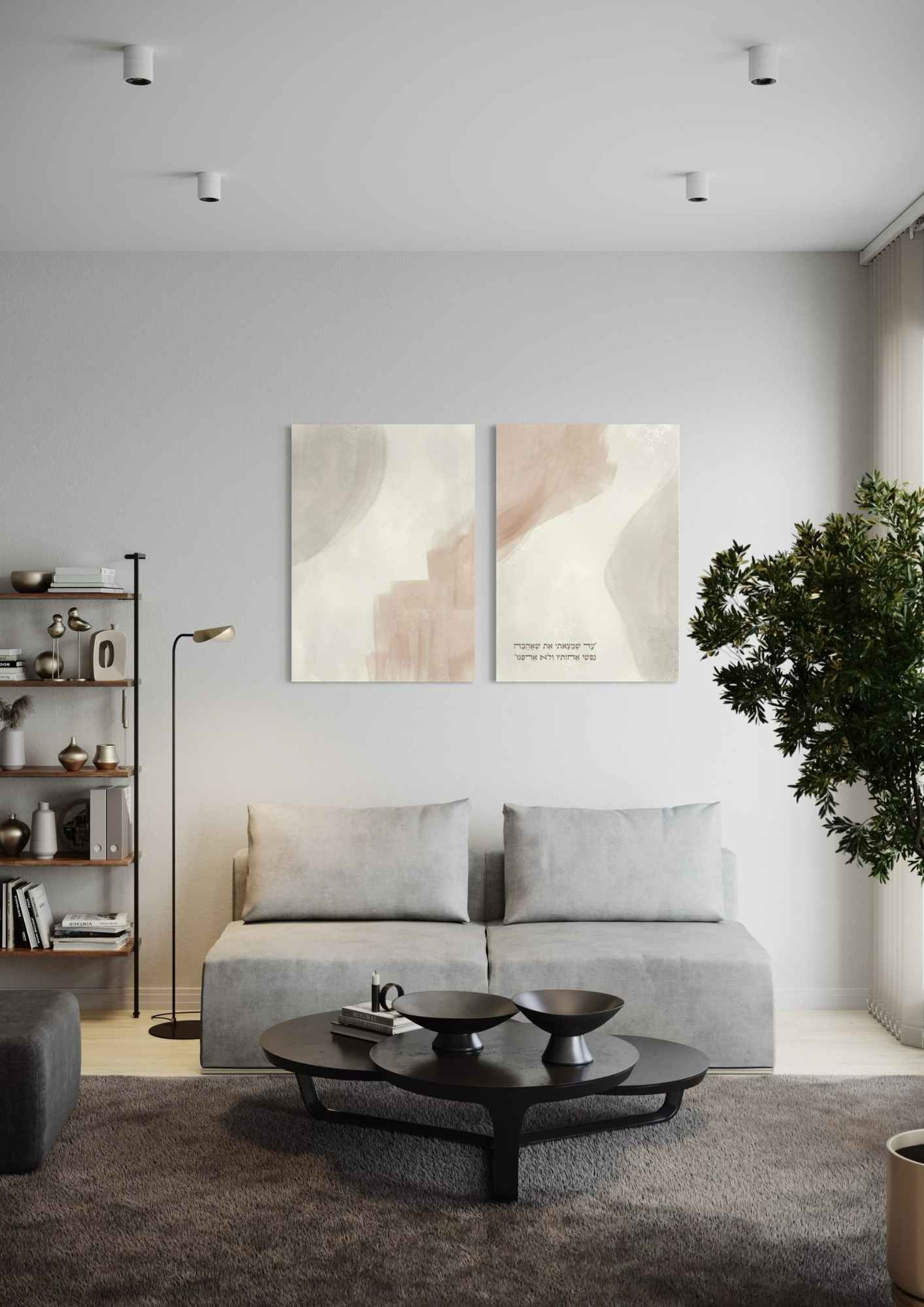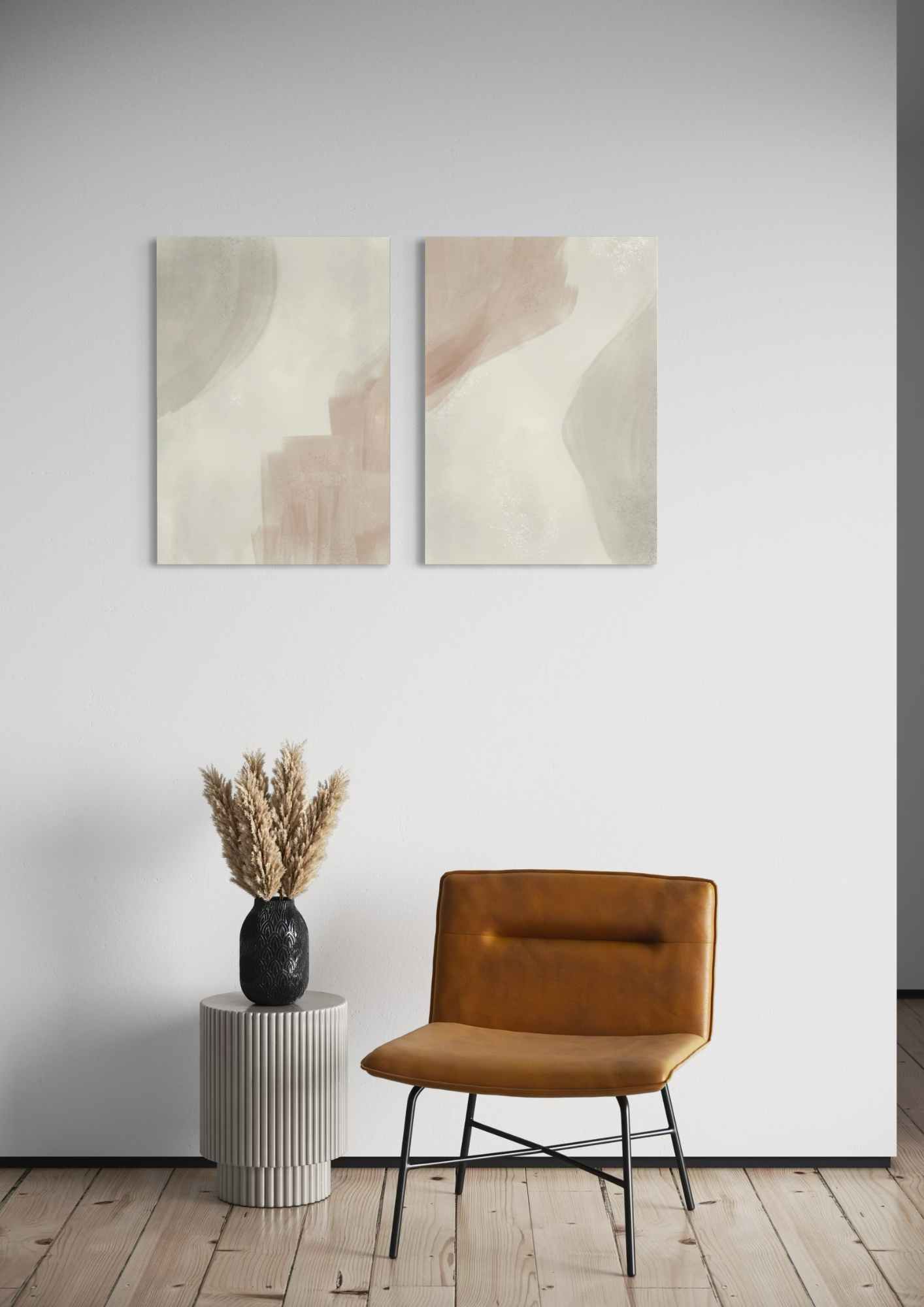 צמד ציורים מופשטים ועדינים בגווני שמנת, ורוד מעושן ואפור רך, היוצרים תחושת חמימות, רוך וחיבוק נעים לחלל.