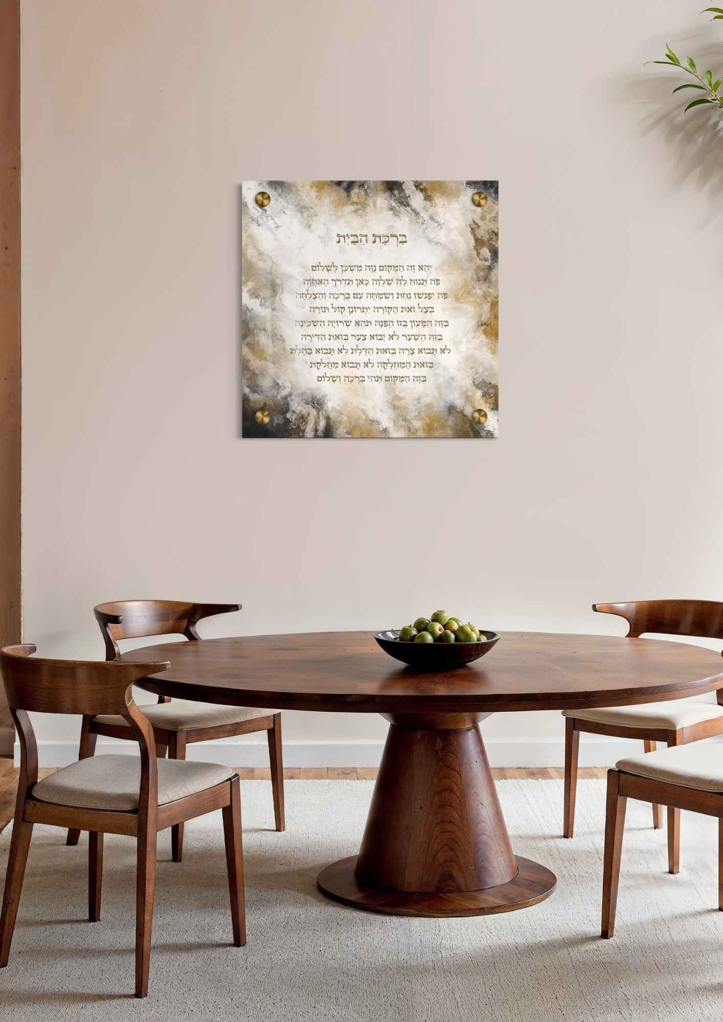 ציור מופשט בסגנון אבסטרקט מודרני בגווני שחור לבן ונגיעות זהב עדינות. ציור מושלם וייחודי לבית שמוסיף ייחודית ומשתלב בכל עיצוב מודרני. במרכז היצירה ״ברכת הבית״ .