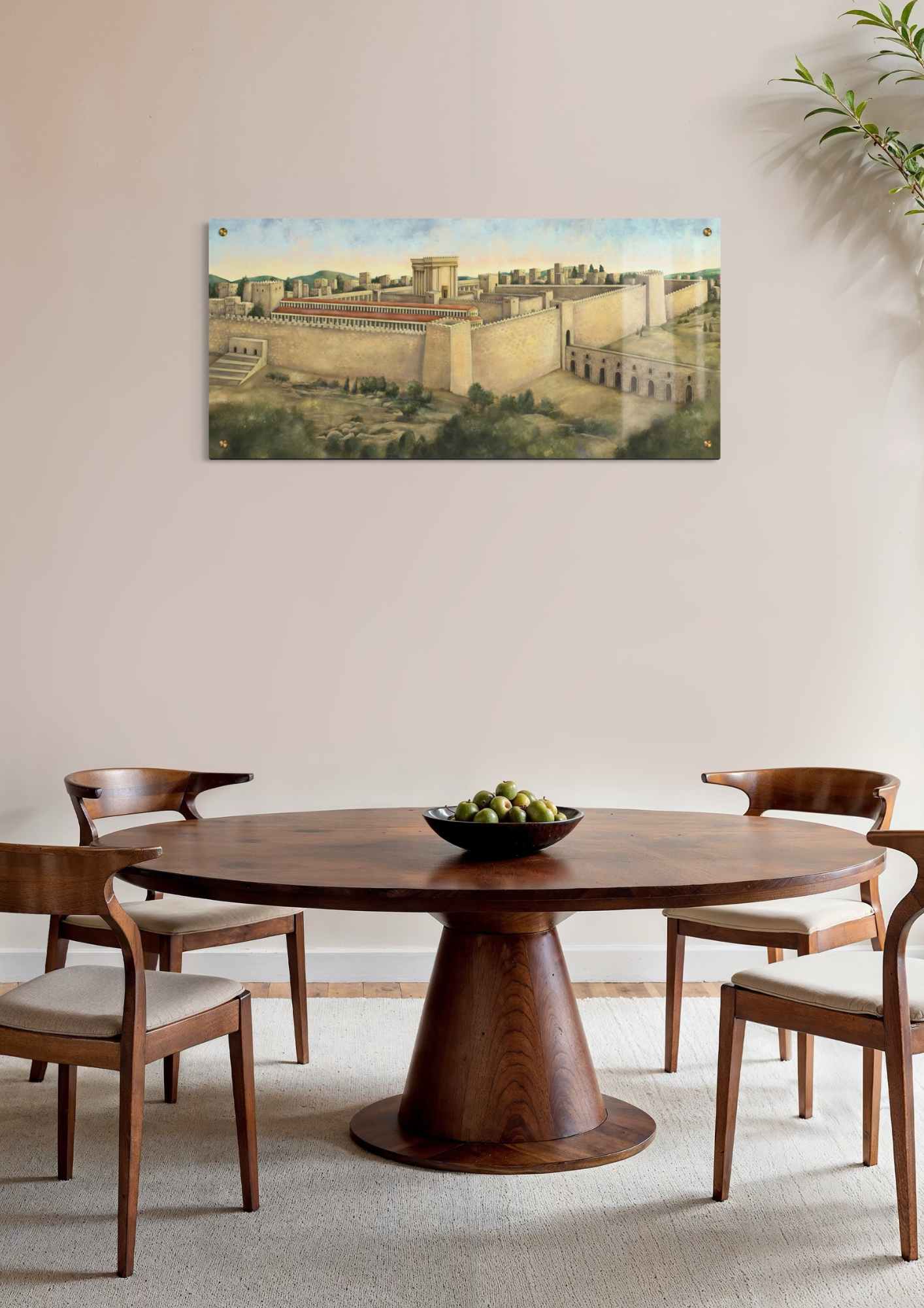 ציור של בית המקדש בין הרי ירושלים בגוונים פסטלים בסגנון ריאליסטי ציורי. בציור מתואר בית המקדש במרכז ומסביבו חומות ובתים המקיפים אותו, שמיים בשקיעה מהפנטת וצמחיה עשירה בחלק התחתון של היצירה.