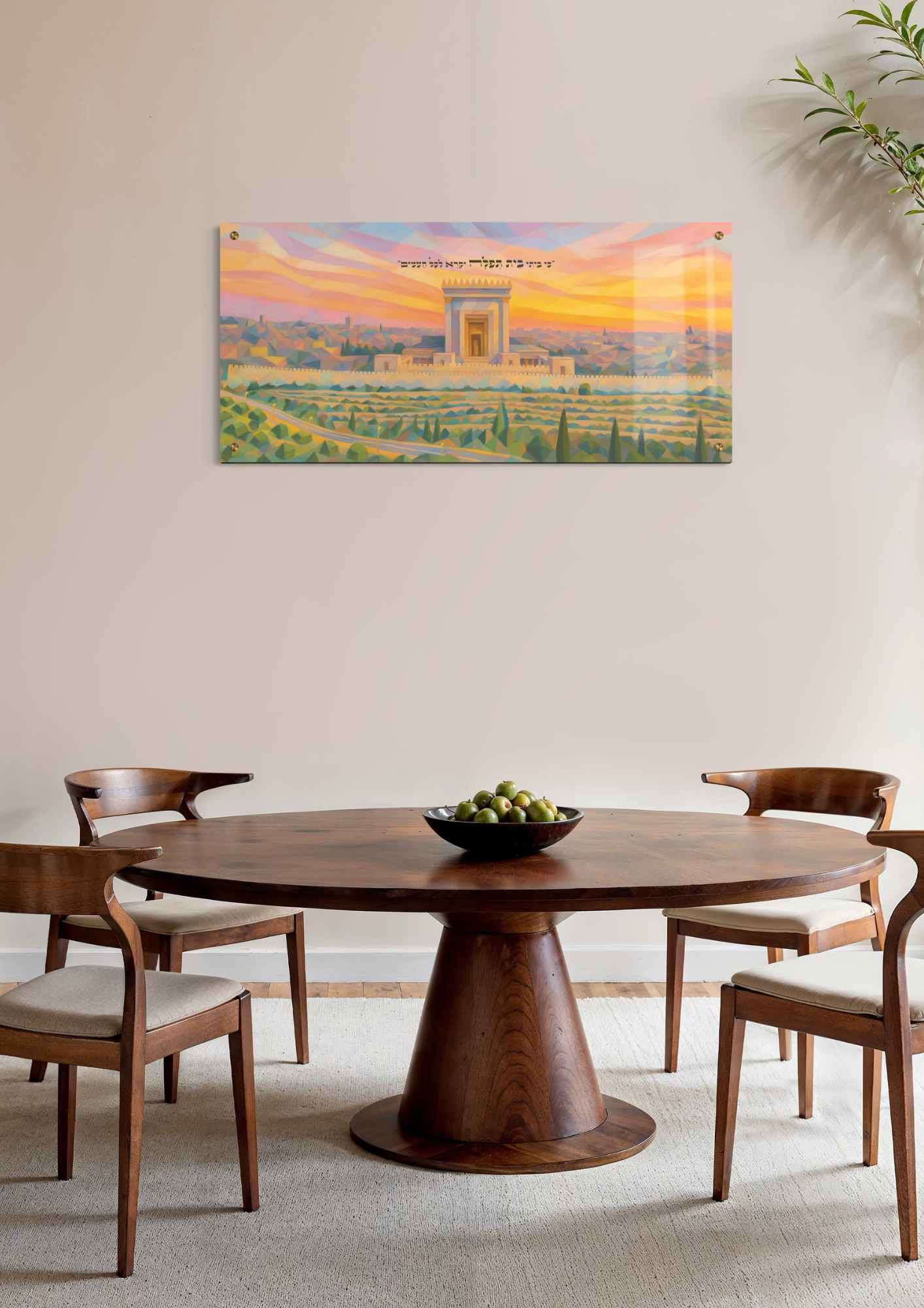 ציור של בית המקדש השלישי בין הרי ירושלים, בסגנון קוביסטי-פסטלי רך ועכשווי. היצירה מתארת את בית המקדש ניצב במרכז הקומפוזיציה, שופע הדר ומוקף חומות מוצקות ובתי אבן גיאומטריים, המשתלבים בנוף הירושלמי.