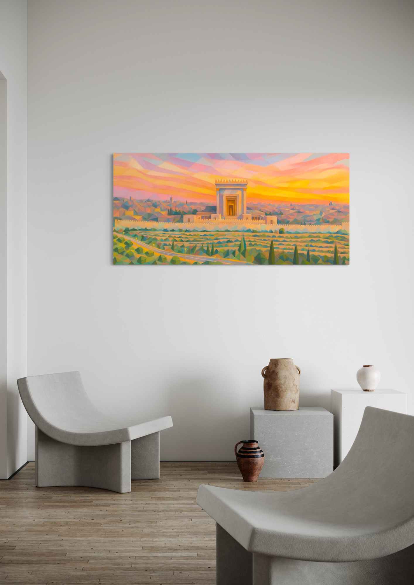 ציור של בית המקדש השלישי בין הרי ירושלים, בסגנון קוביסטי פסטלי רך ועכשווי. היצירה מתארת את בית המקדש ניצב במרכז הקומפוזיציה, שופע הדר ומוקף חומות מוצקות ובתי אבן גיאומטריים, המשתלבים בנוף הירושלמי.