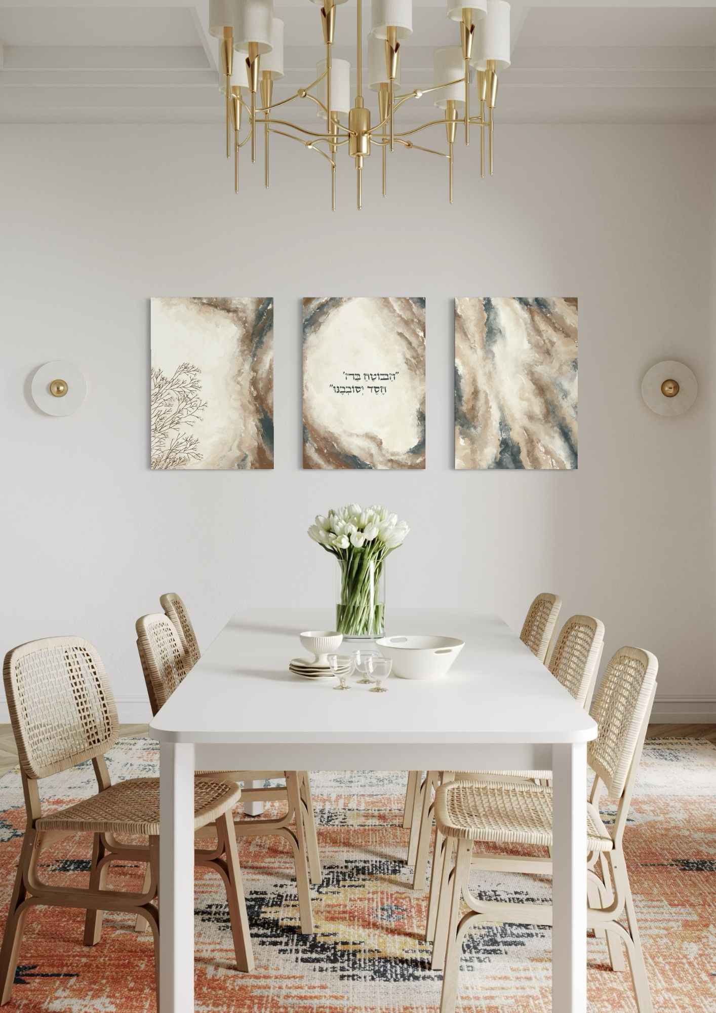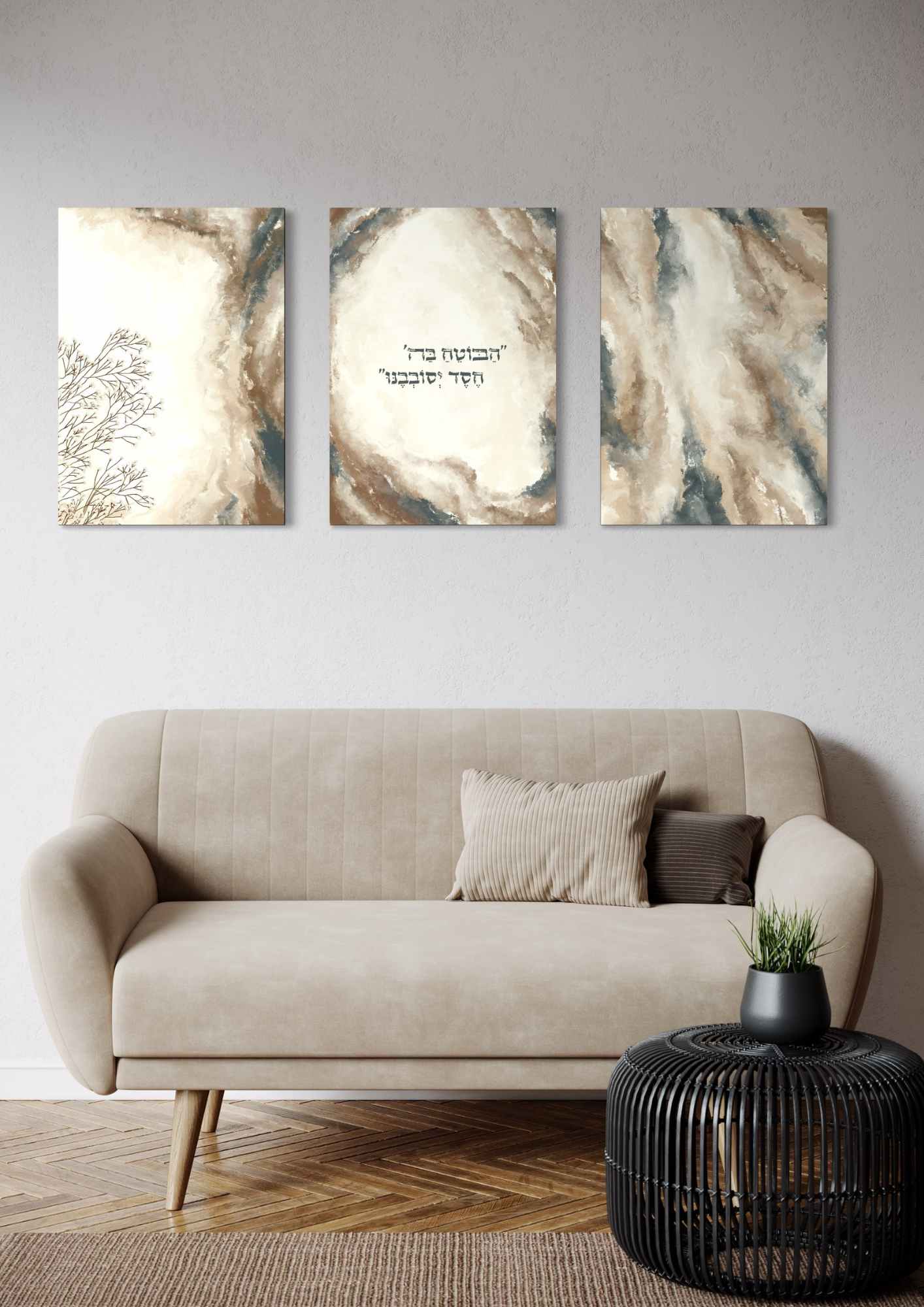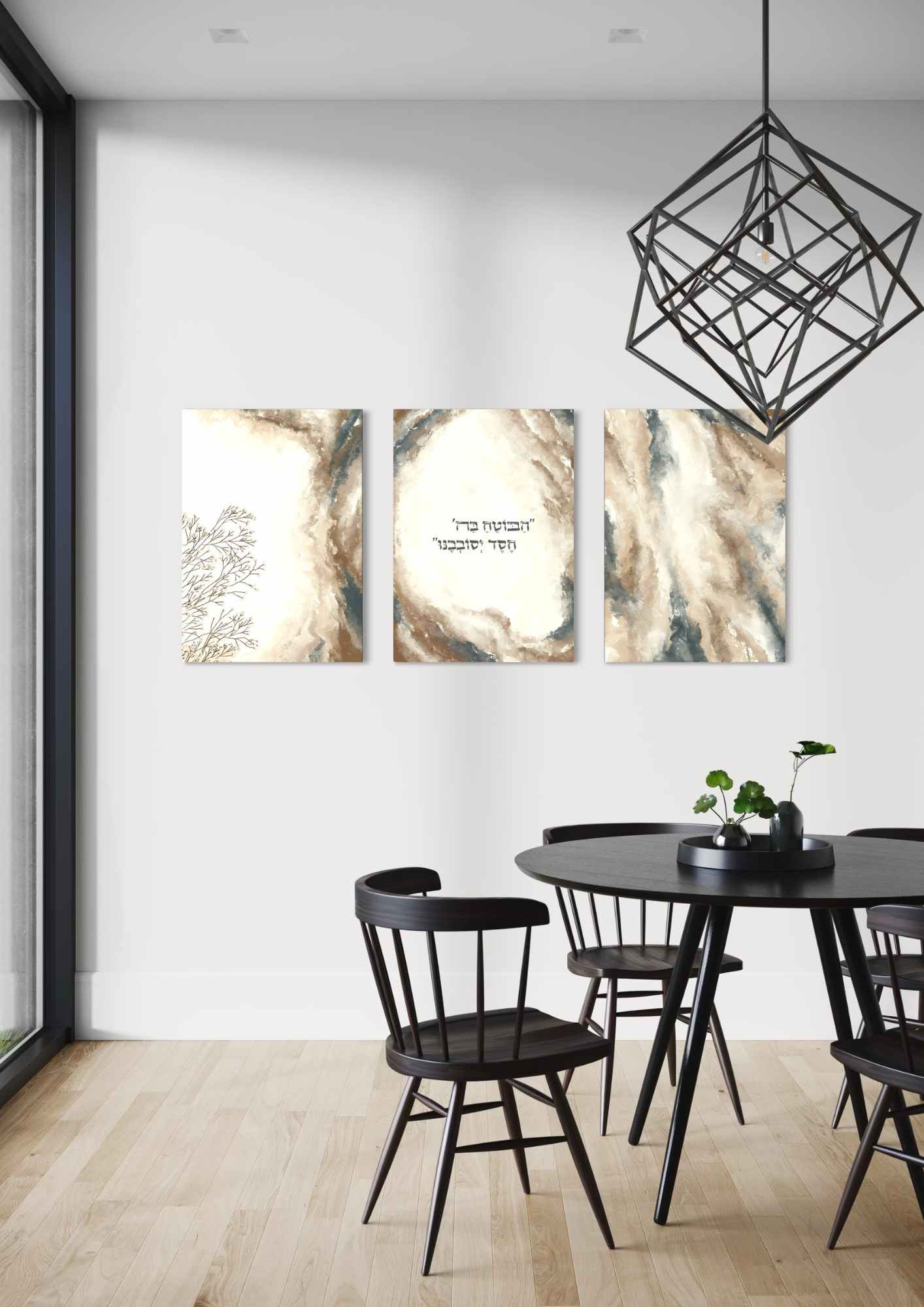 שלישיית קנבסים בגווני שמנת, חום, ב'ז וירוק מצוירים בסגנון אבסטרקט מופשט מודרני בשילוב המילים מהפסוק בתהילים: ”הַבּוֹטֵחַ בַּה' חֶסֶד יְסוֹבְבֶנּוּ״