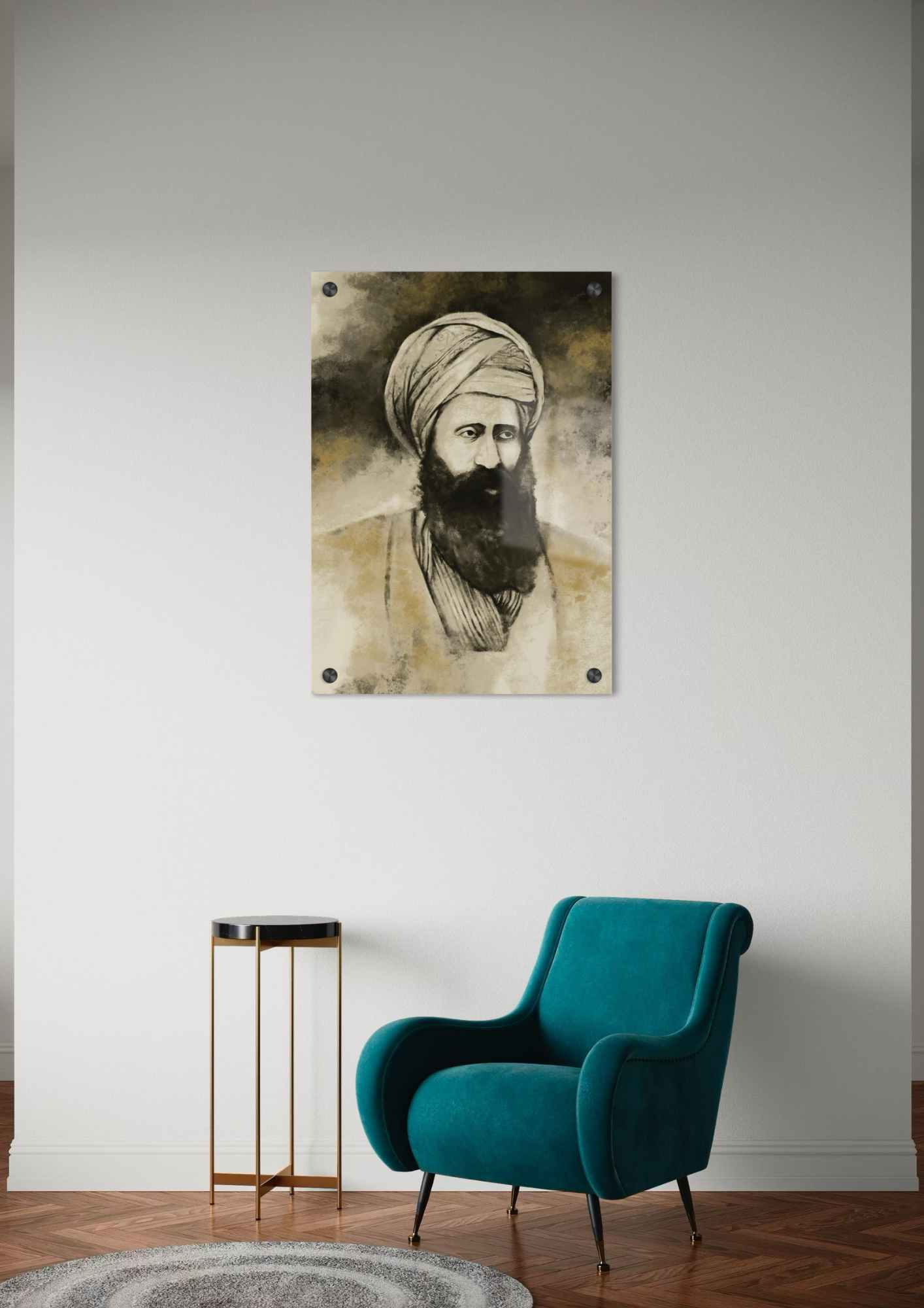 ציור דיוקן של מרן הבן איש חי, פוסק ומקובל נודע מבגדד, מתואר בציור זה ברוגע עוצמתי. פניו עטורי זקן כהה, לבושו מזרחי וטורבנו העשיר בפרטים מדגיש את שורשיו ותקופתו. דמותו נישאת בגאון ובצניעות גם יחד.