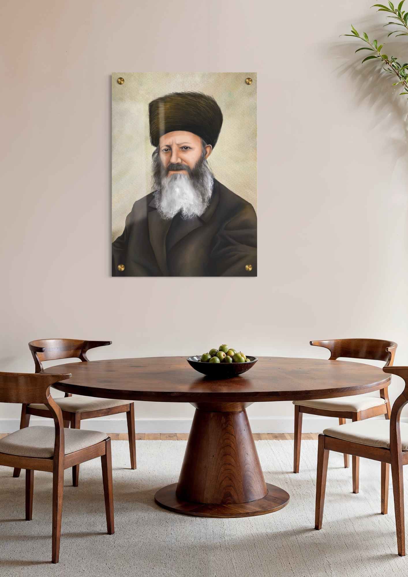 ציור דיוקן של הרב יורם מיכאל אברג׳ל זצ״ל בסגנון היפר ריאליזם המדגיש את תווי פניו המאירות של הרב וירידה לפרטים הכי קטנים. החל מתיאור כל שערה וקמט, ועד לאותיות הקטנות בספר הלימוד ממנו לומד הרב. הרב מחייך ומאיר פנים, הרקע בסגנון אבסטרקט מופשט המדמה קצת קיר אבן מואר באור עז שמתכתב עם פניו המאירות של הרב.