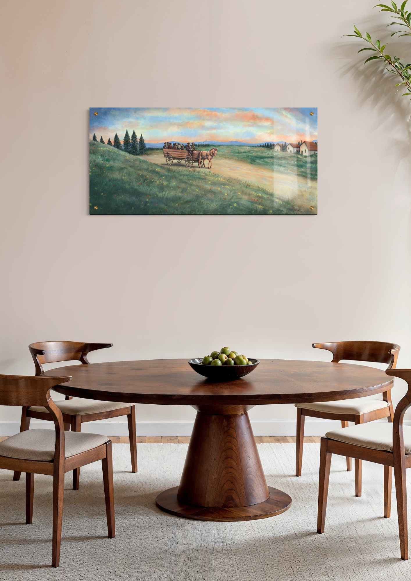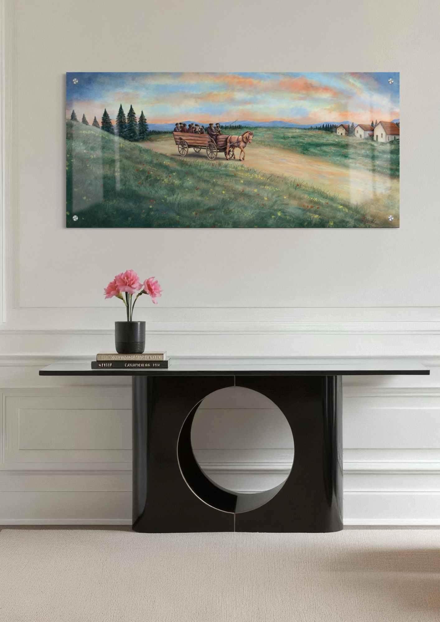 ציור נוף רחב בגווני פסטל עזים. ביצירה מתוארת עגלת משא רתומה לסוס ובתוכה חסידים ורבי. החסידים מתוארים כאשר הם שותים כוס משקה, בעיצומו של דבר תורה מרתק מפי רבם. העגלה נוסעת על שביל אלכסוני בין צמחייה ופריחה, ומעט בתים בצד הדרך בחלק הימני של היצירה. בשמים שקיעה מרהיבה בגווני כחול, תכלת, כתמתם וצהוב.