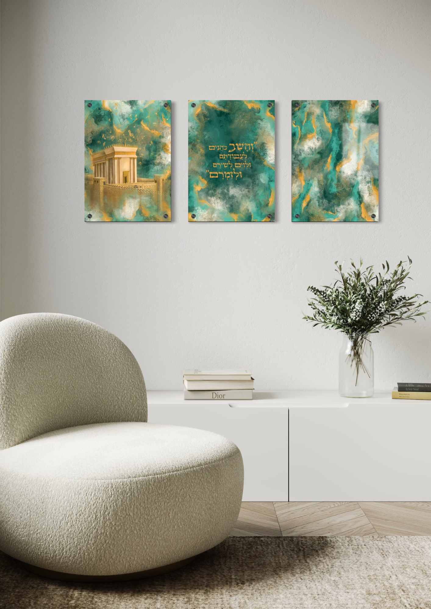 שלישיית ציורים בגווני טורכיז כהה ובהיר, שמנת, וזהב בסגנון אבסטרקט מודרני עם המילים "וְהָשֵׁב כֹּהֲנִים לַעֲבוֹדָתָם וּלְוִיִּם לְשִׁירָם וּלְזִמְרָם".