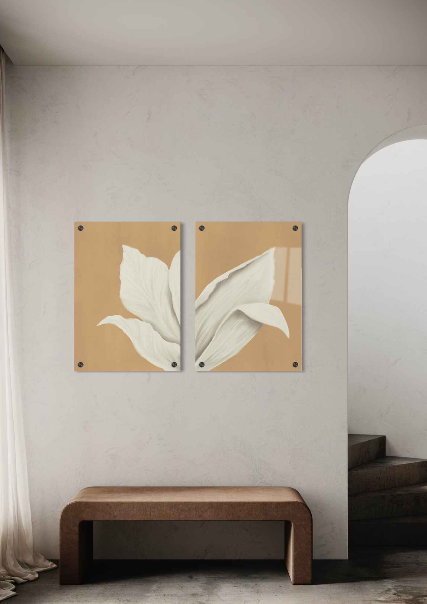 צמד ציורים עדינים ורכים של עלי פרח לבנים על רקע בגוון חום-זהוב חמים, המשדרים טוהר, צניעות ואלגנטיות טבעית.