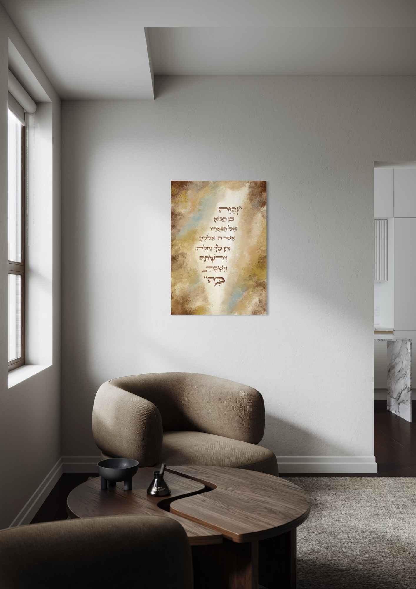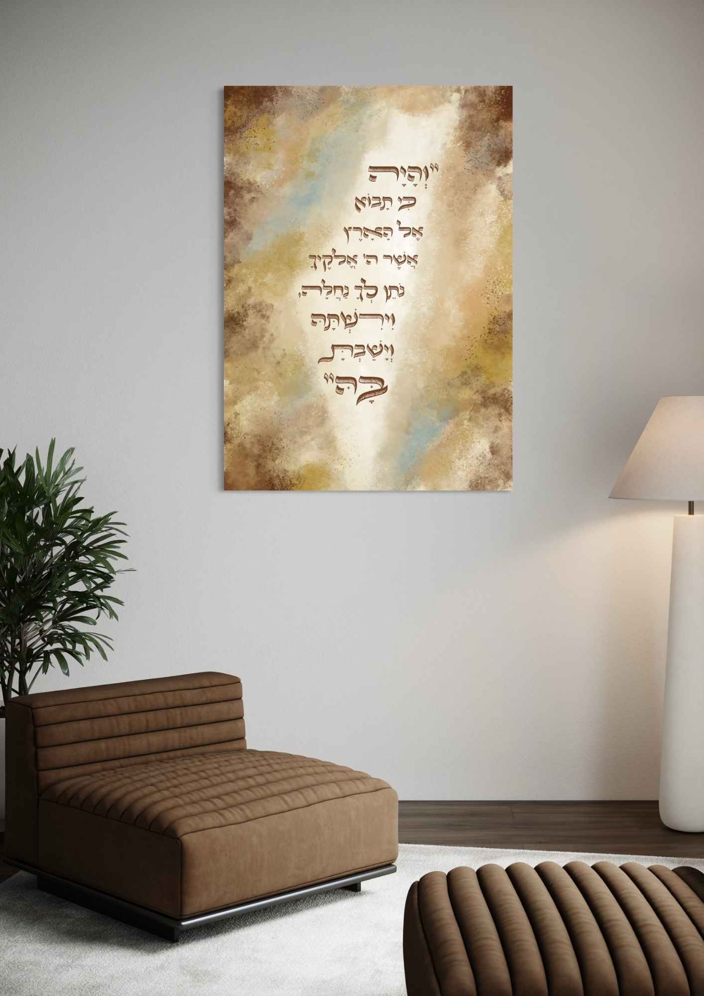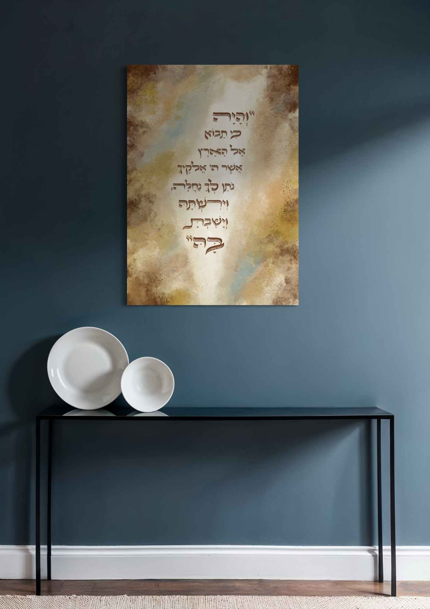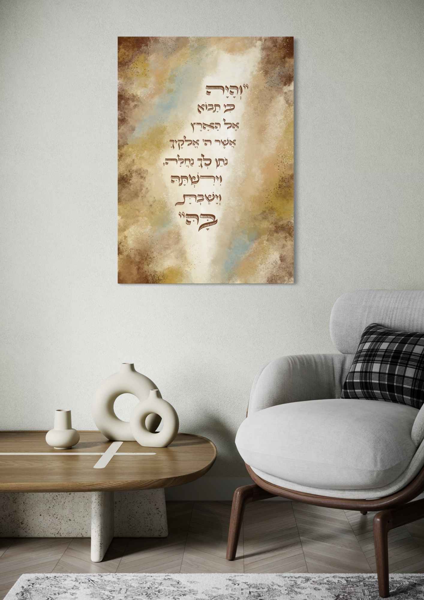 יצירה מרשימה ובעלת עומק רוחני המשלבת את הפסוק המלא מתוך דברים כ״ו, א׳ עם אזכור עדין למפת ארץ ישראל המשתלב ברקע המופשט: