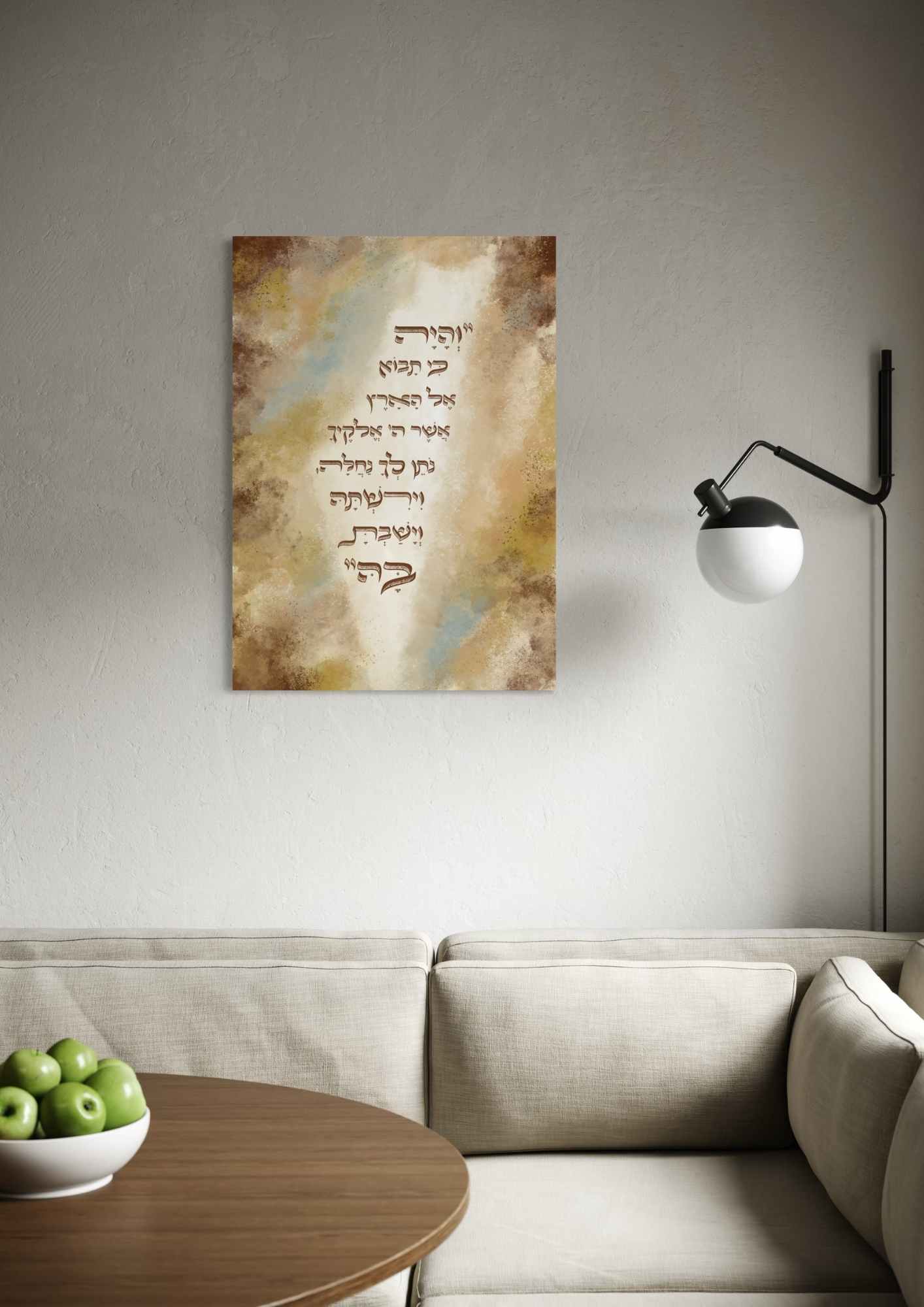 הפסוק מופיע בטיפוגרפיה ברורה ואלגנטית ומלווה ברקע המדמה אדמה וזמן, מבלי להעמיס – אלא להזמין התבוננות וחיבור.