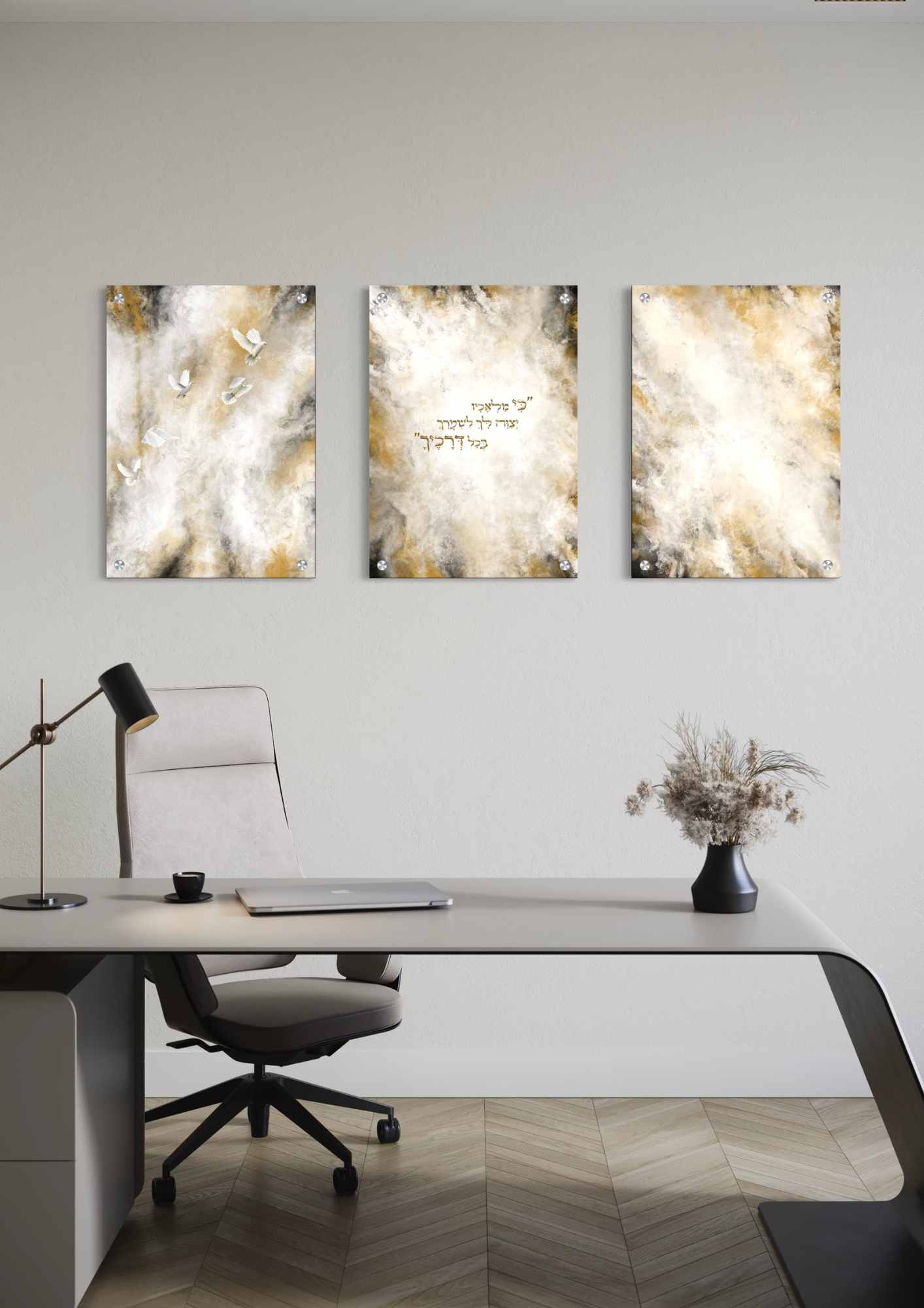 שלישיית ציורים בגווני זהב, שמנת ושחור צבועים בסגנון אבסטרקט מופשט מודרני בשילוב הפסוק מתהילים: ״כִּי מַלְאָכָיו יְצַוֶּה לָּךְ לִשְׁמָרְךָ בְּכָל דְּרָכֶיךָ״