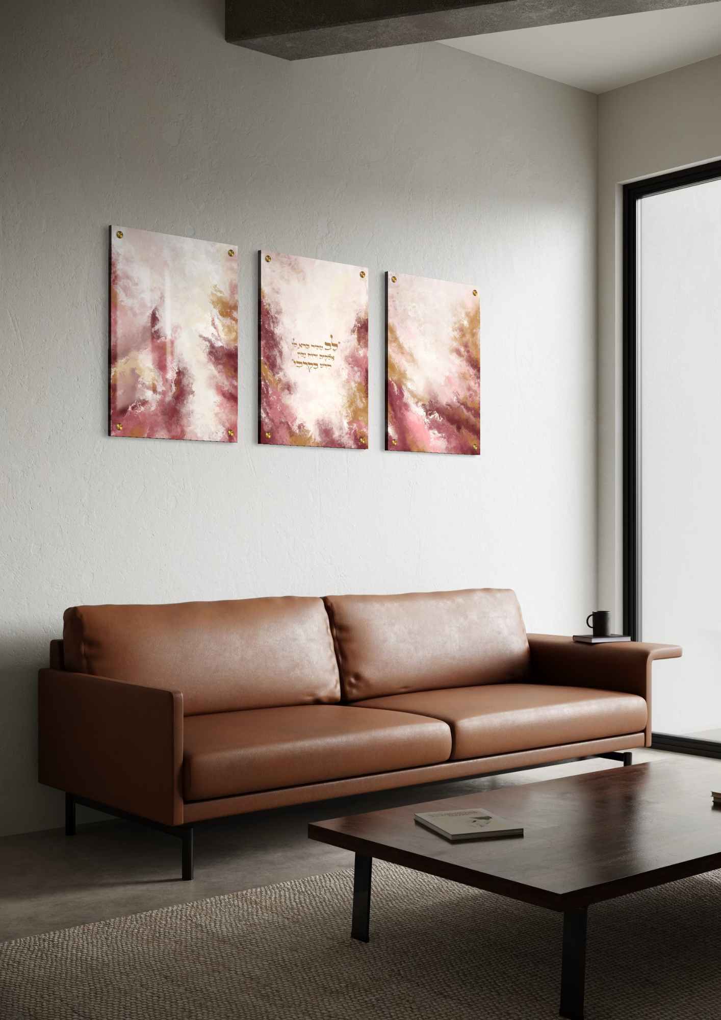 שלישיית ציורים בגווני ורוד שמנת וזהב בסגנון אבסטרקט מודרני בשילוב הפסוק מתהילים מ״ג: ״לֵב טָהוֹר בְּרָא לִי אֱלֹקים וְרוּחַ נָכוֹן חַדֵּשׁ בְּקִרְבִּי״.