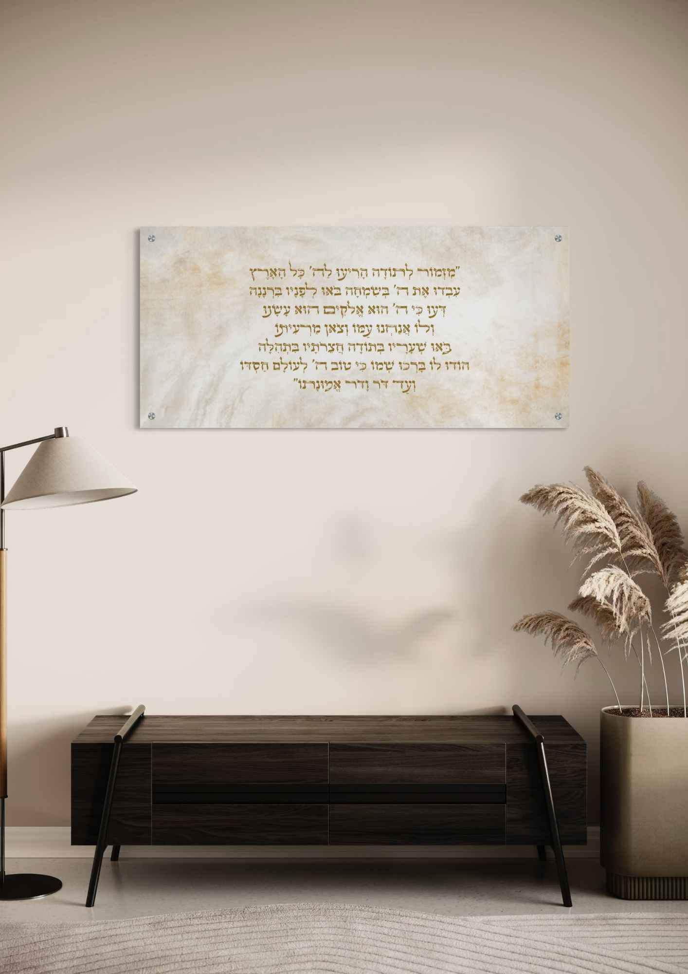 יצירה אבסטרקטית בגווני אבן, שמנת ולבן עם נגיעות זהב עדינות. במרכז היצירה המזמור ״מזמור לתודה״ היצירה משדרת נעימות, הרמוניה ושלווה, יצירה נקייה שמשתלבת בכל חלל בצורה הרמונית.