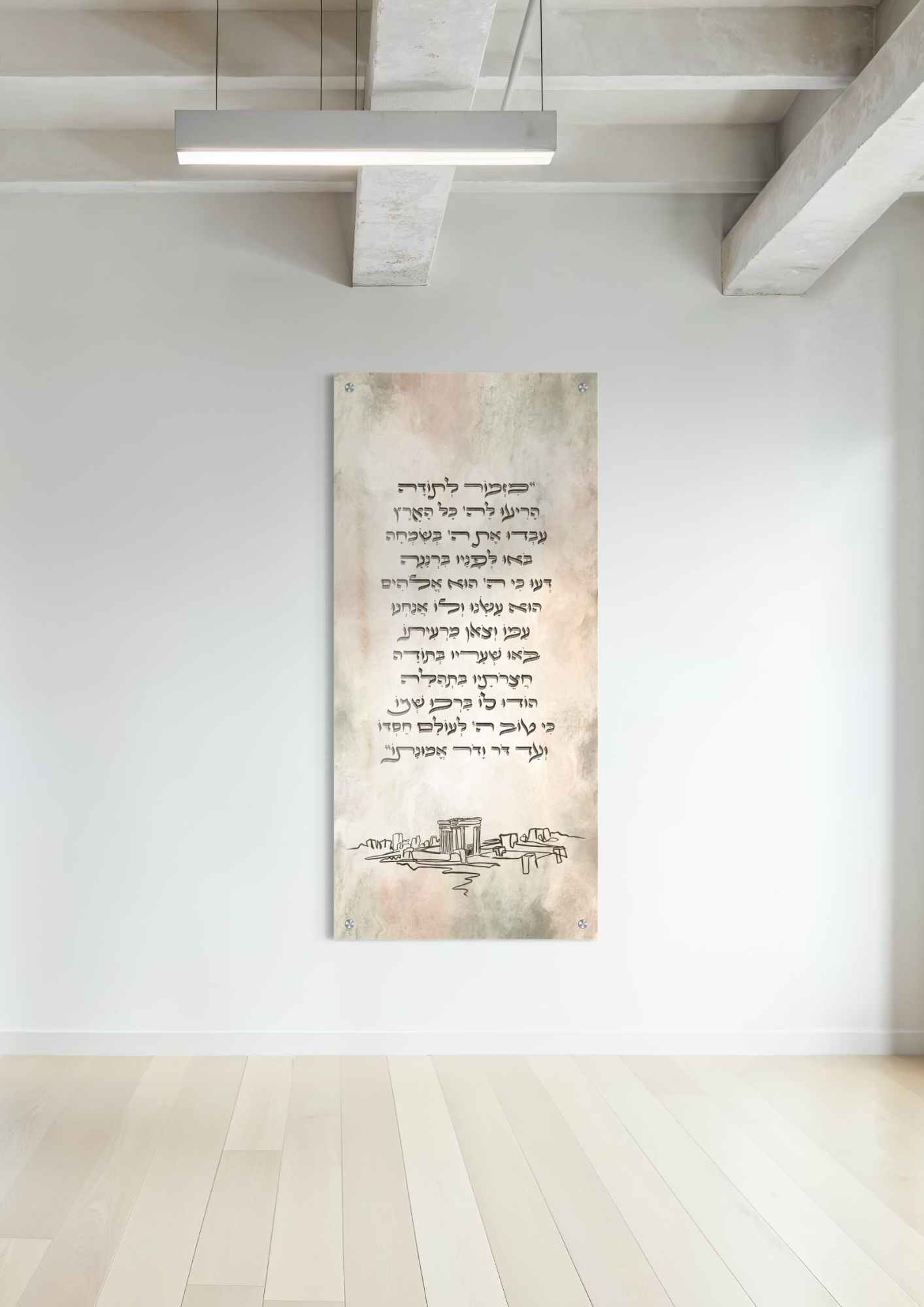 יצירה אנכית מרגשת המשלבת את פרק ק׳ בתהילים  מזמור לתודה” עם איור עדין של בית המקדש בקו נקי ומינימליסטי.
