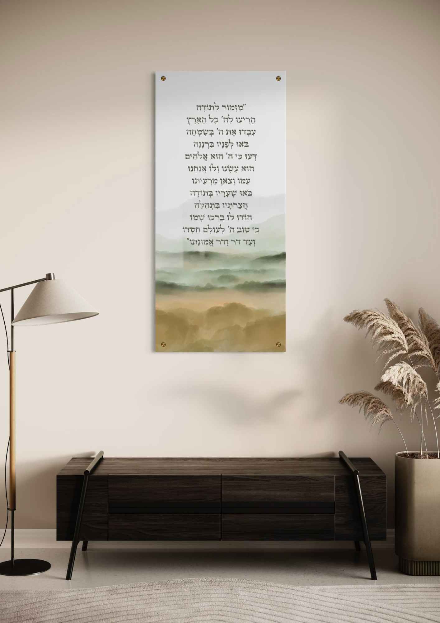 ציור נקי, מעט מופשט של טבע, הרים וצמחיה בגוונים בהירים של ירוקים, חומים ולבן. במרכז היצירה משולב פרק ק׳ מתהילים ״מזמור לתודה״.