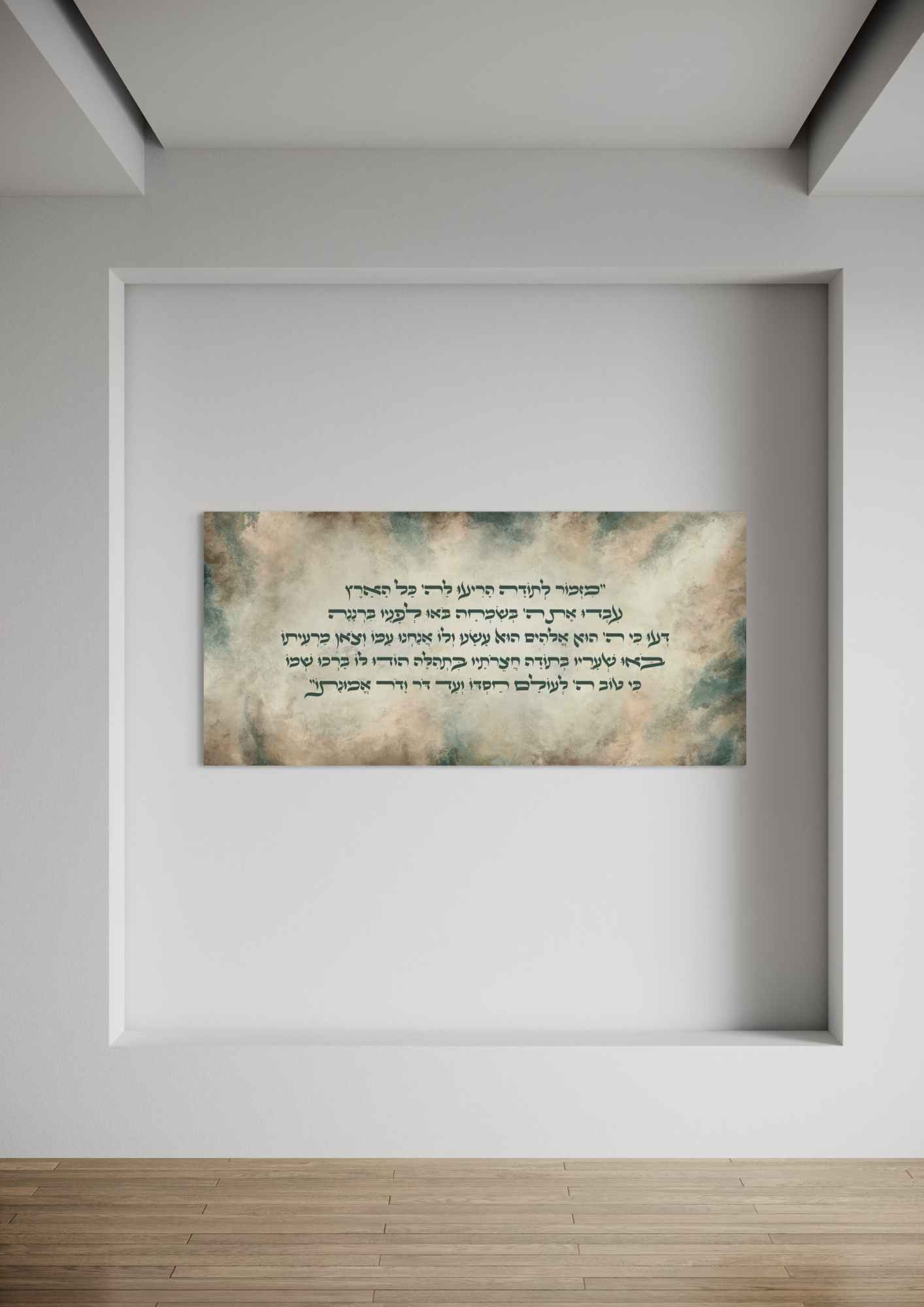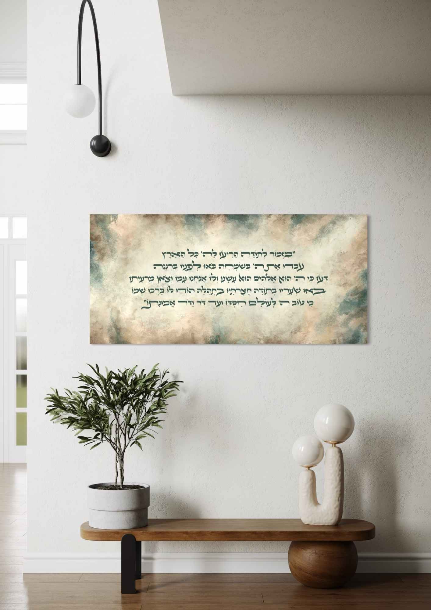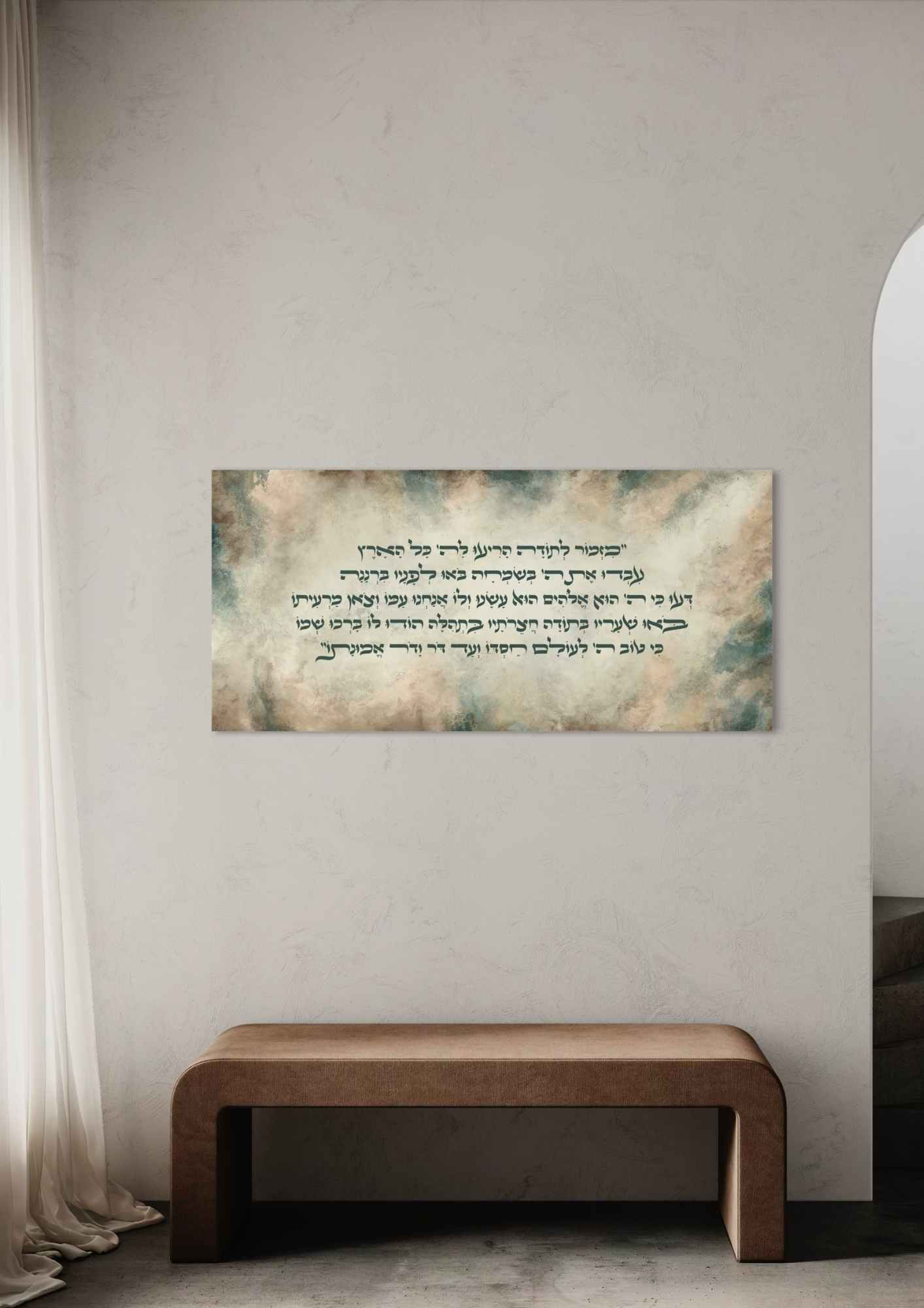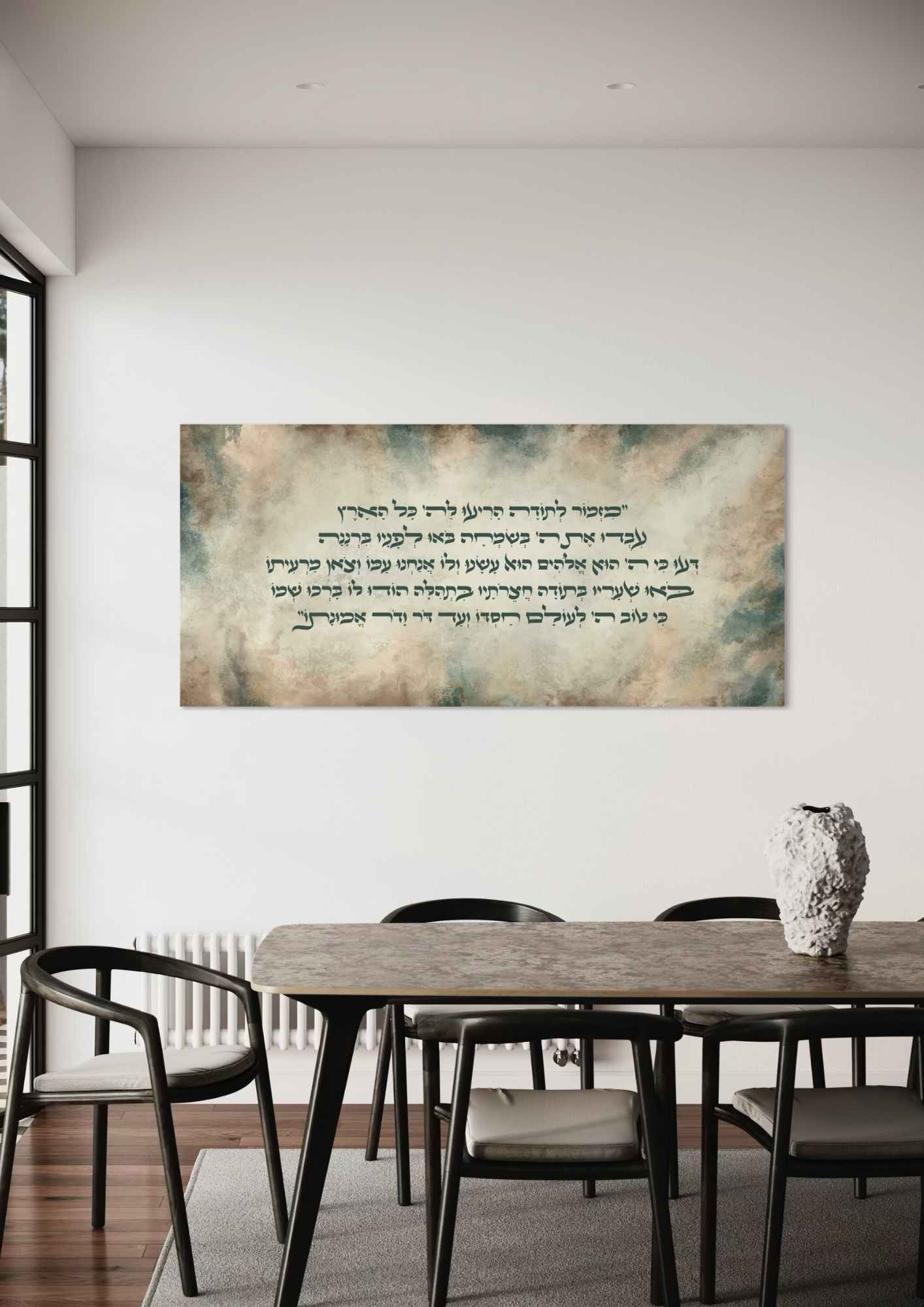 יצירה מרשימה ומרוממת עם פרק ק׳ בתהילים – ״מזמור לתודה”, תפילה של הודיה, שמחה ואמונה. הטקסט משולב על רקע אבסטרקטי בגווני שמנת, טורקיז ונגיעות זהב רכות, היוצרים תחושת רוגע, ניקיון ופתיחות בחלל.