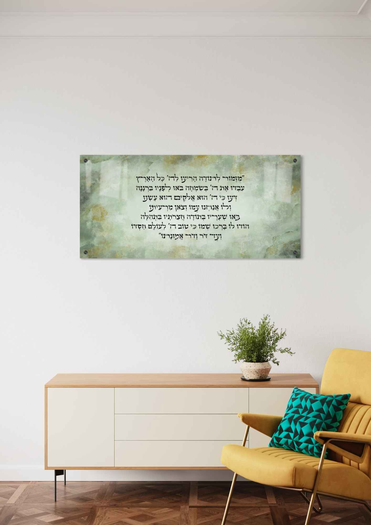 יצירה רחבה אבסטרקטית בהדפסה על זכוכית בגווני ירוק מנטה ונגיעות זהב. במרכז היצירה המזמור ״מזמור לתודה״ היצירה משדרת נעימות, הרמוניה ושלווה, הצבעים רגועים ולא דומיננטים.