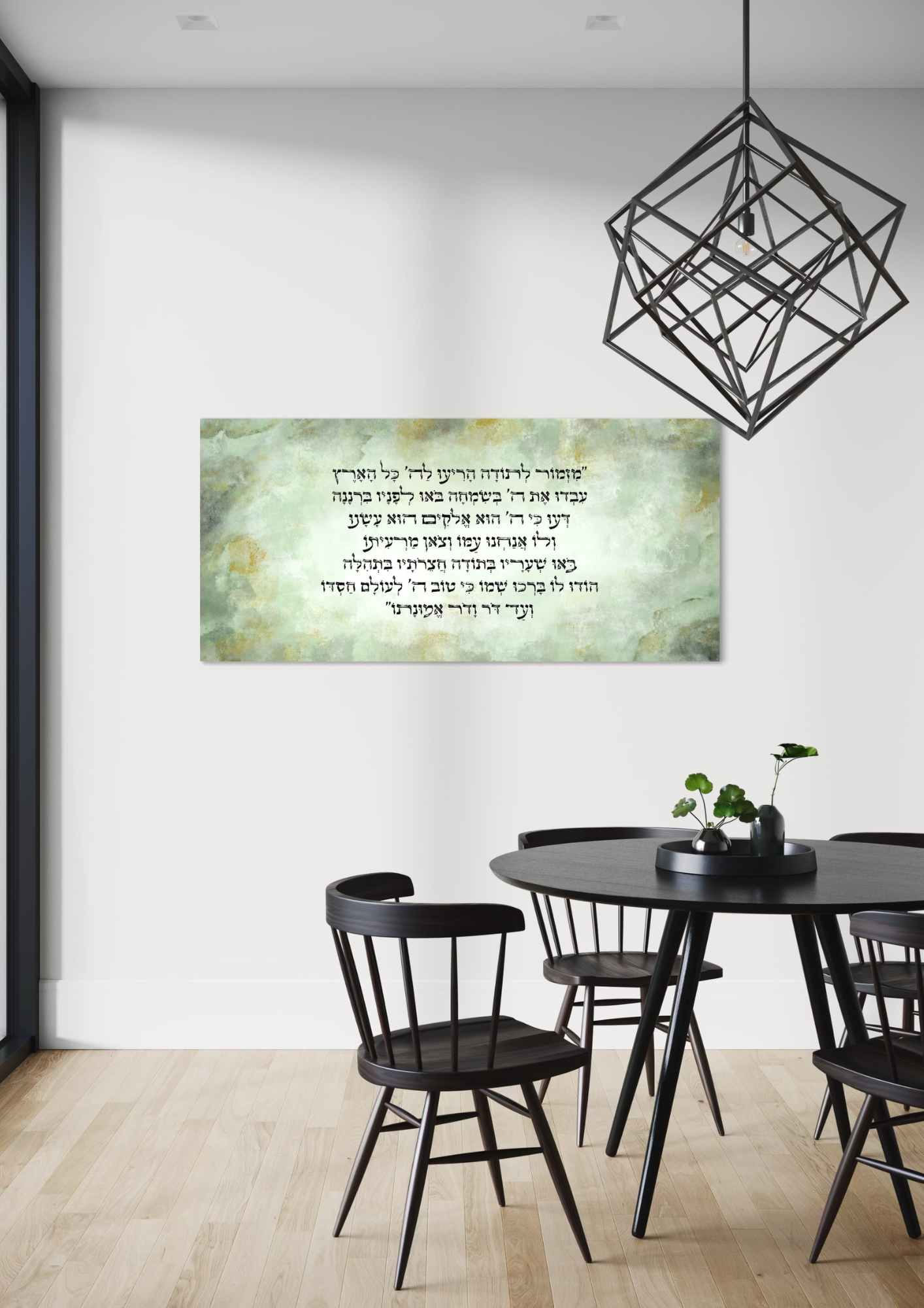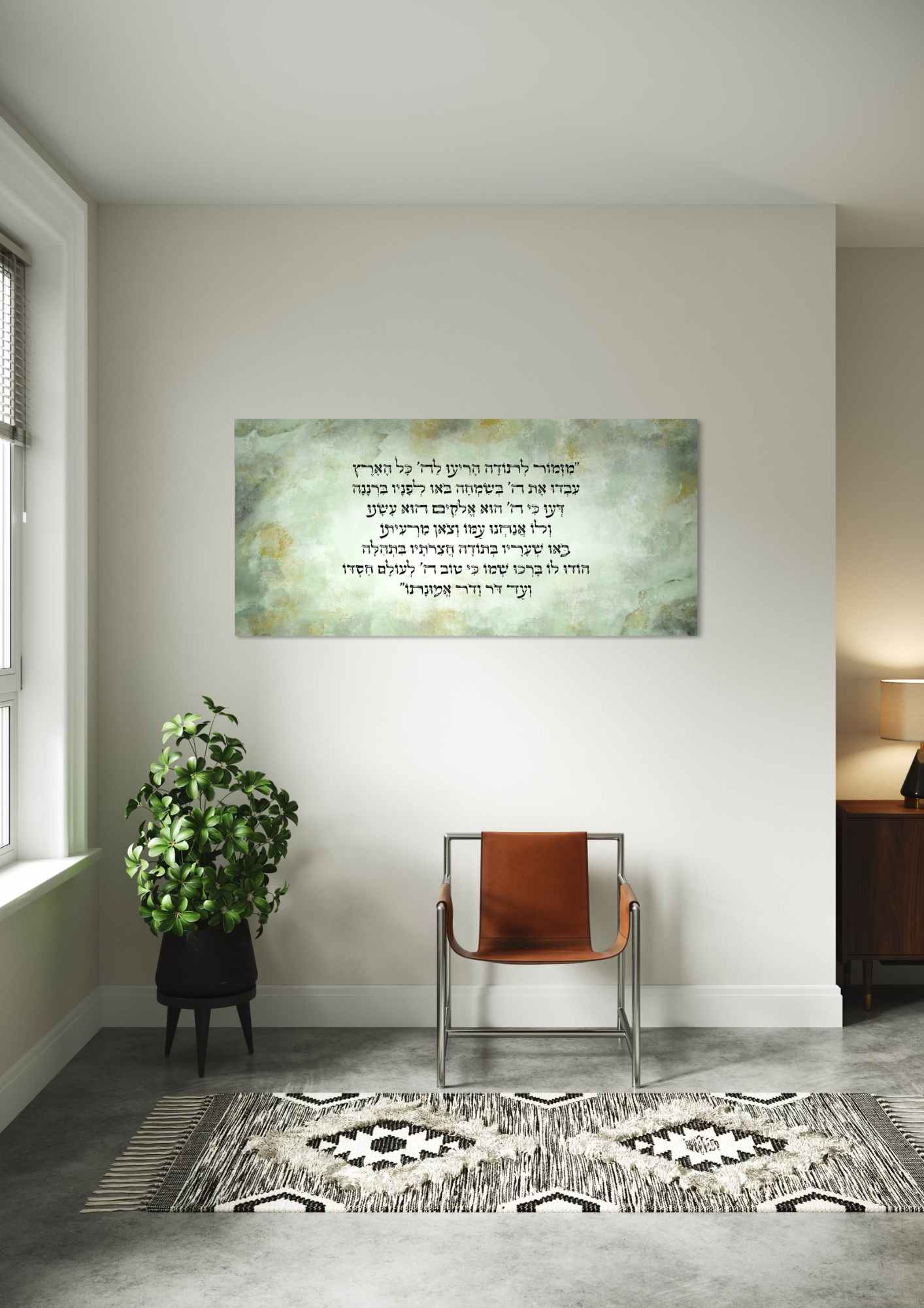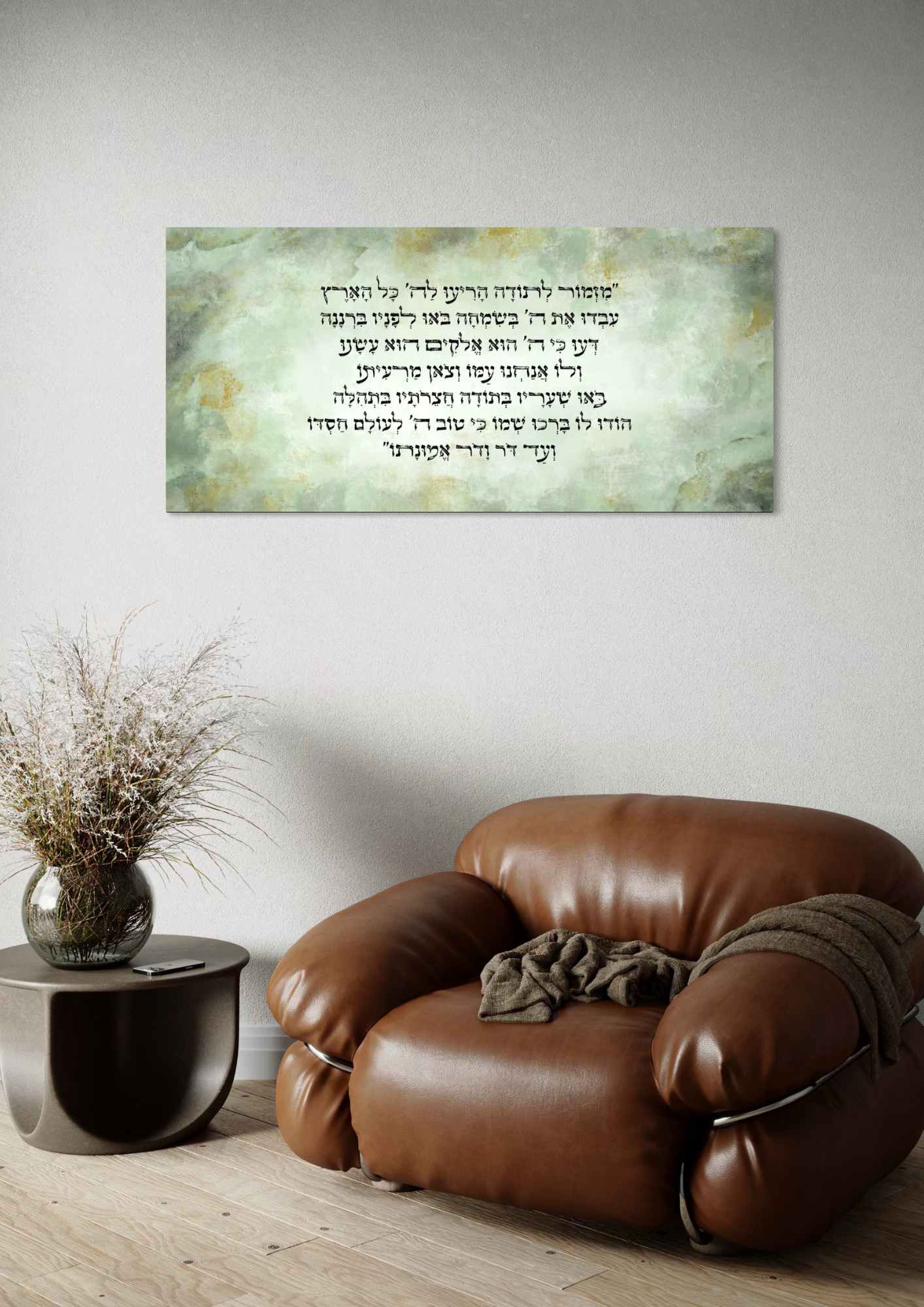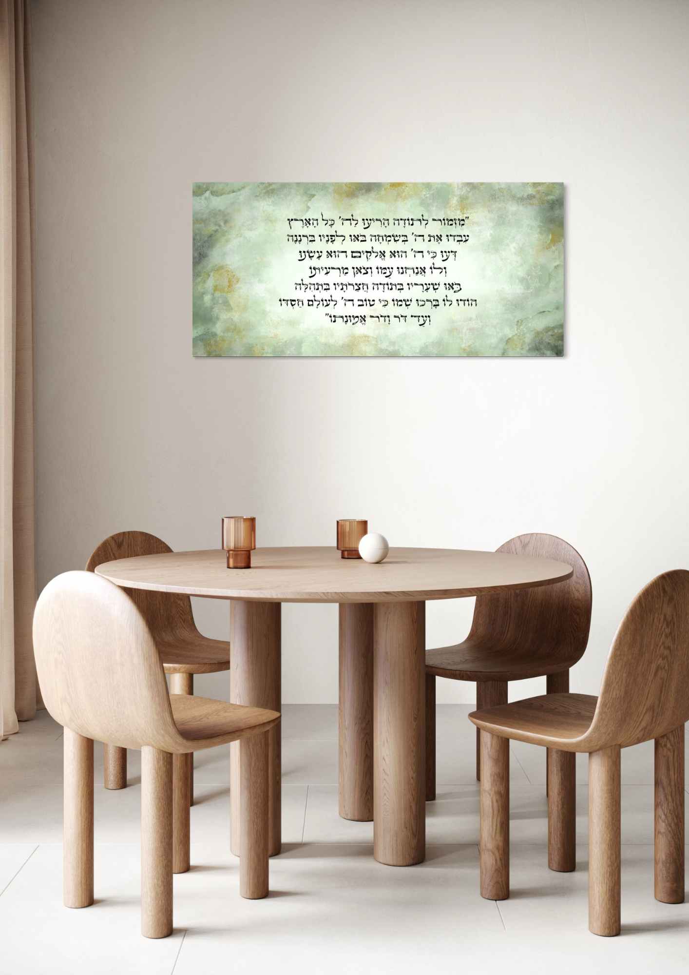 יצירה רחבה אבסטרקטית בהדפסה על קנבס בגווני ירוק מנטה ונגיעות זהב. במרכז היצירה המזמור ״מזמור לתודה״ היצירה משדרת נעימות, הרמוניה ושלווה, הצבעים רגועים ולא דומיננטים.