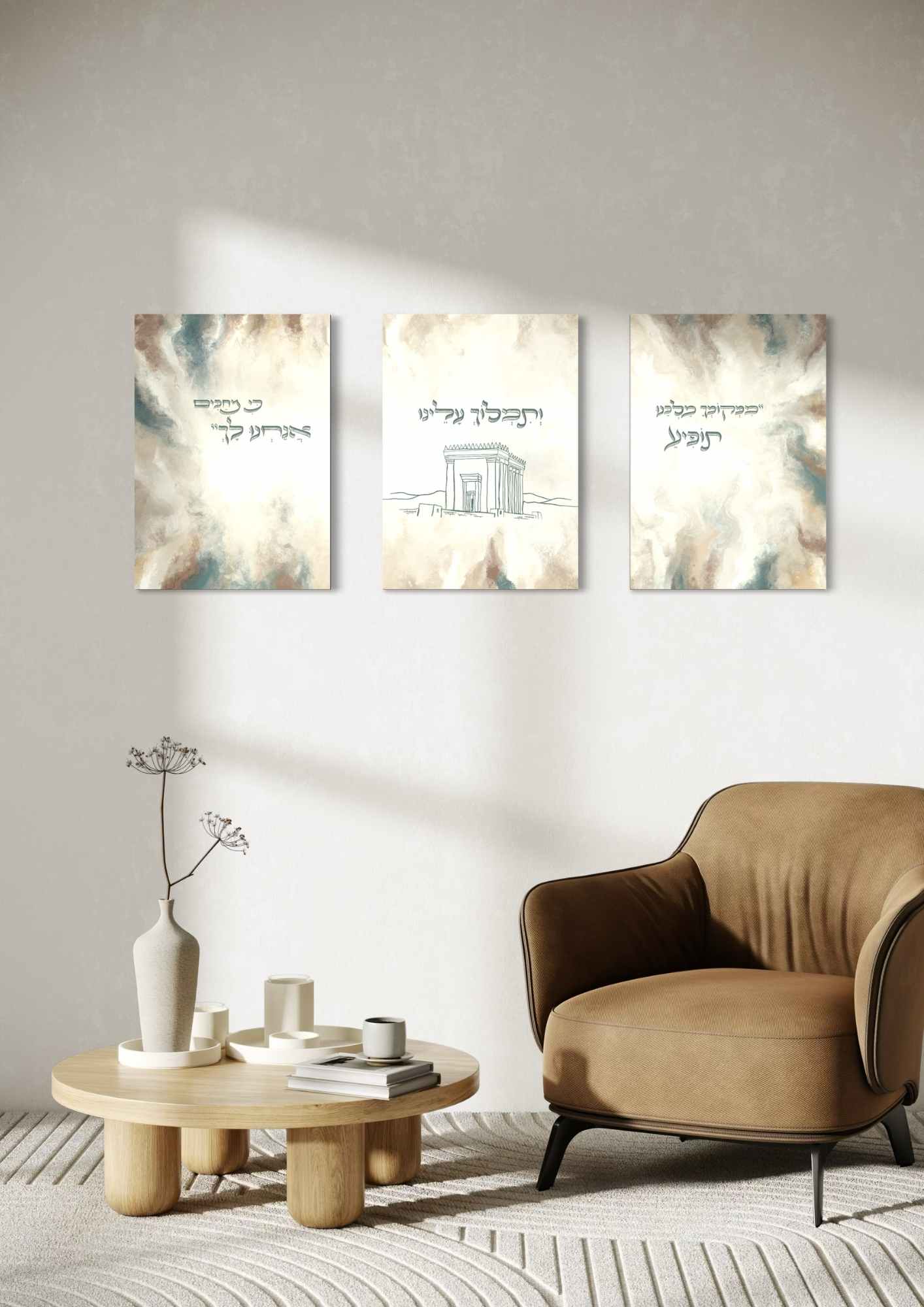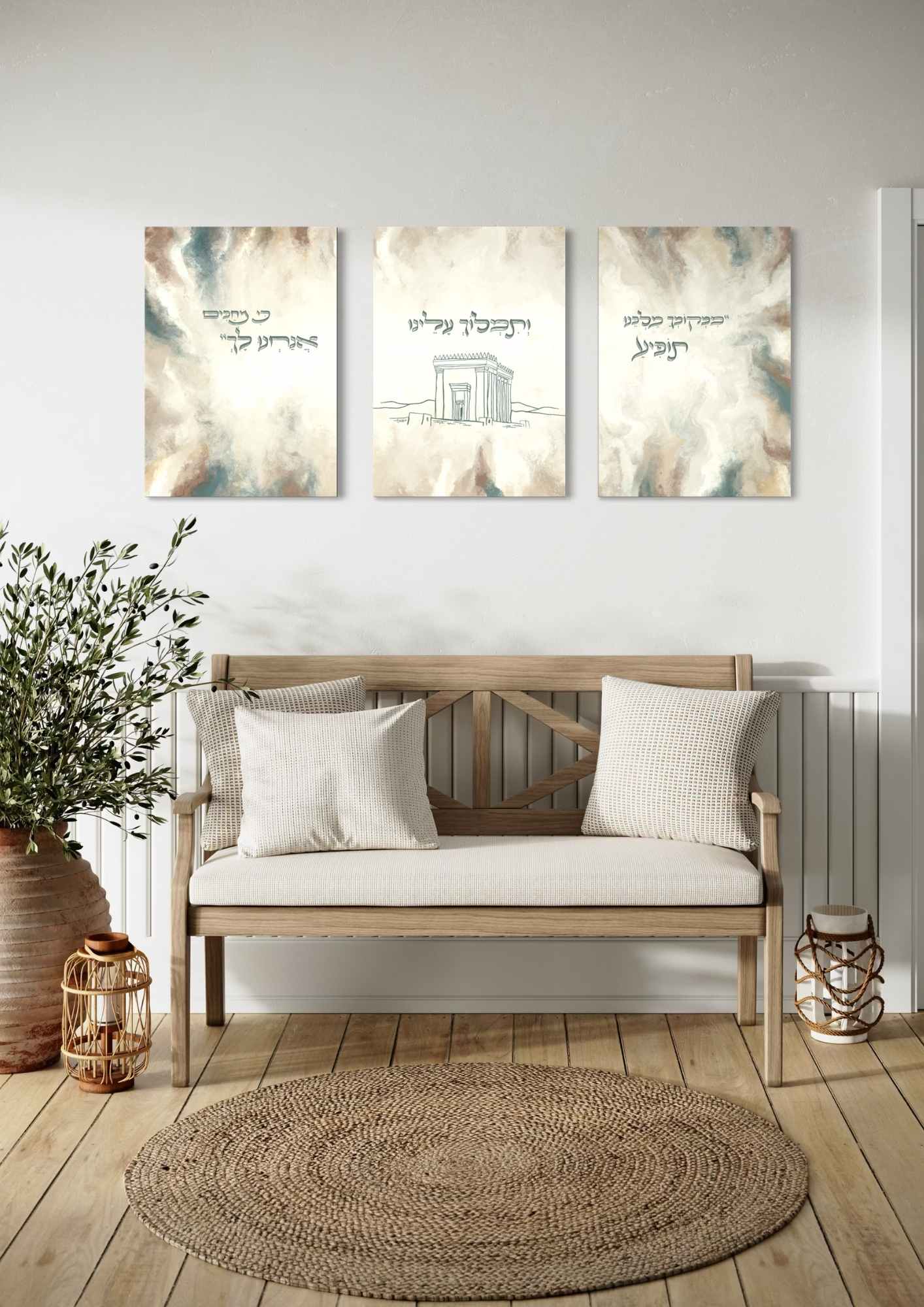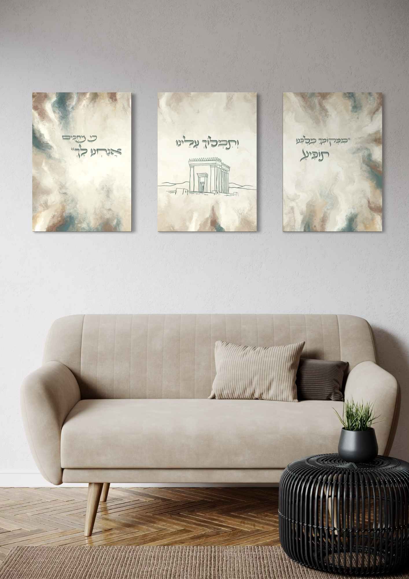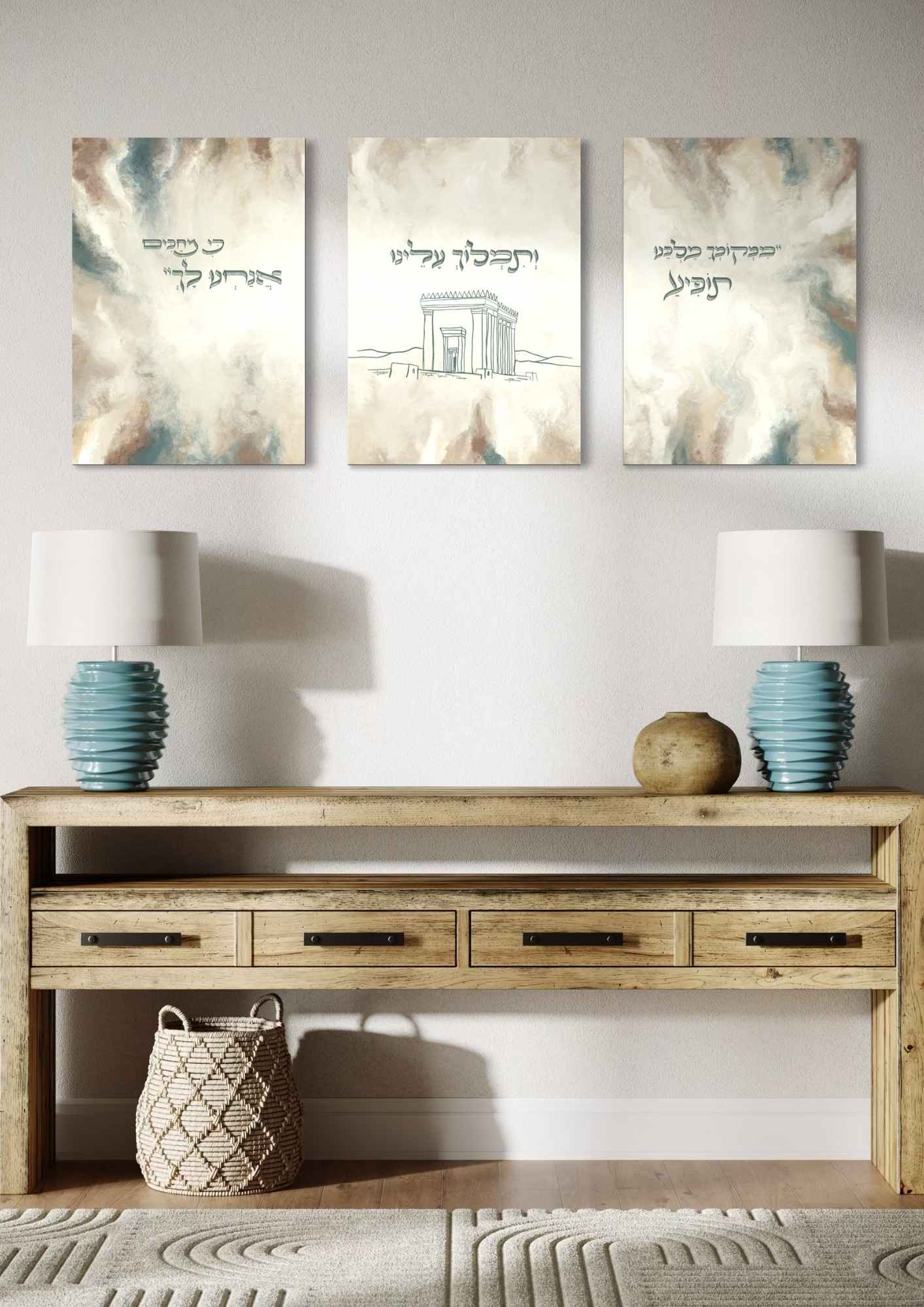 יצירה מרגשת ומרוממת המורכבת משלישיית ציורים בגווני שמנת, סהרה ותכלת מעושן, בסגנון אבסטרקט רך ונקי. במרכז היצירה מופיע איור עדין של בית המקדש, כסמל לכיסופים, תקווה וגאולה.