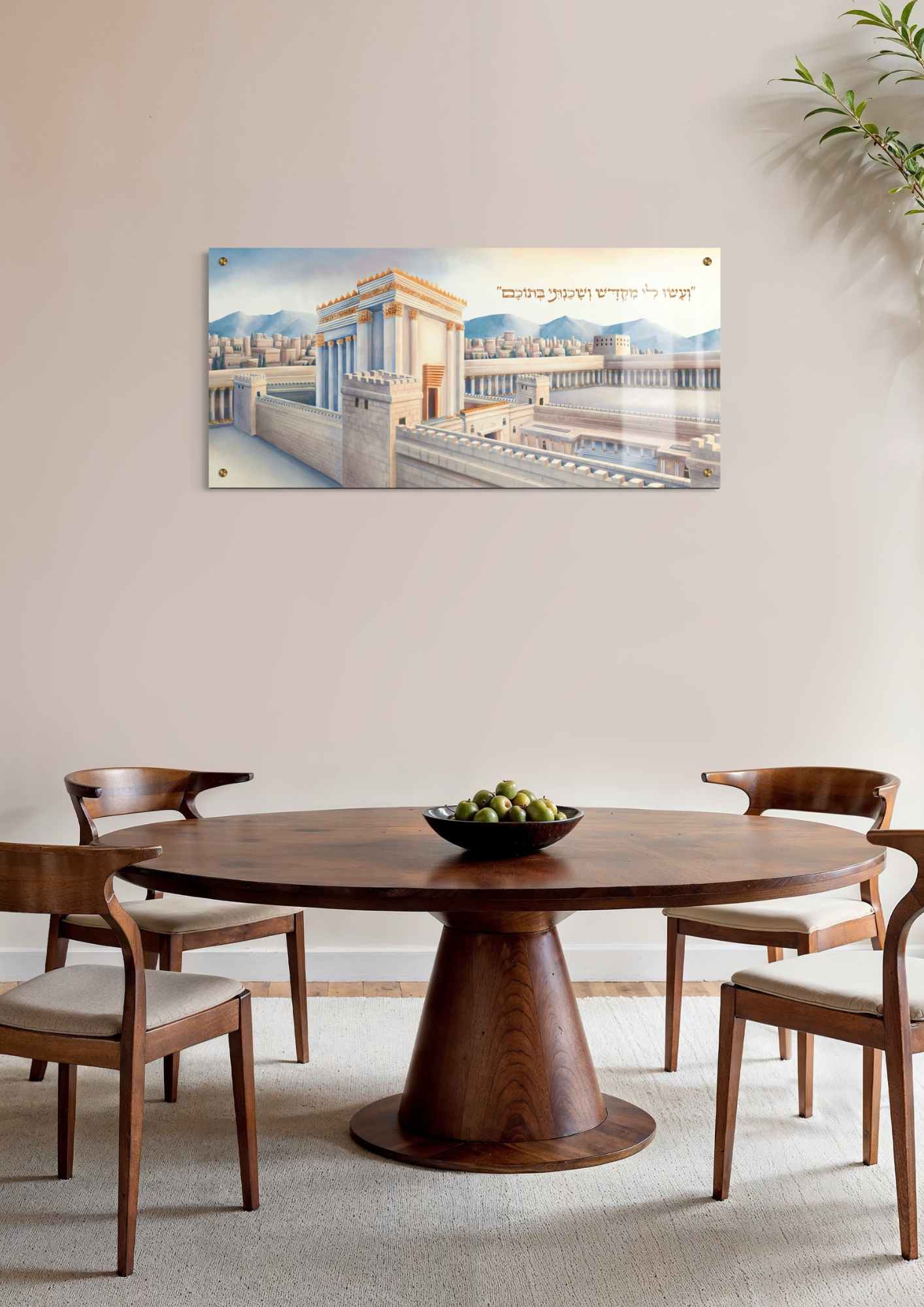בית המקדש מתואר בזווית אלכסונית כשמאחוריו בתים והרים ירושלמים. ביצירה יש פרספקטיבה של עומק ותיאור מפורט של כל הפרטים הקטנים.