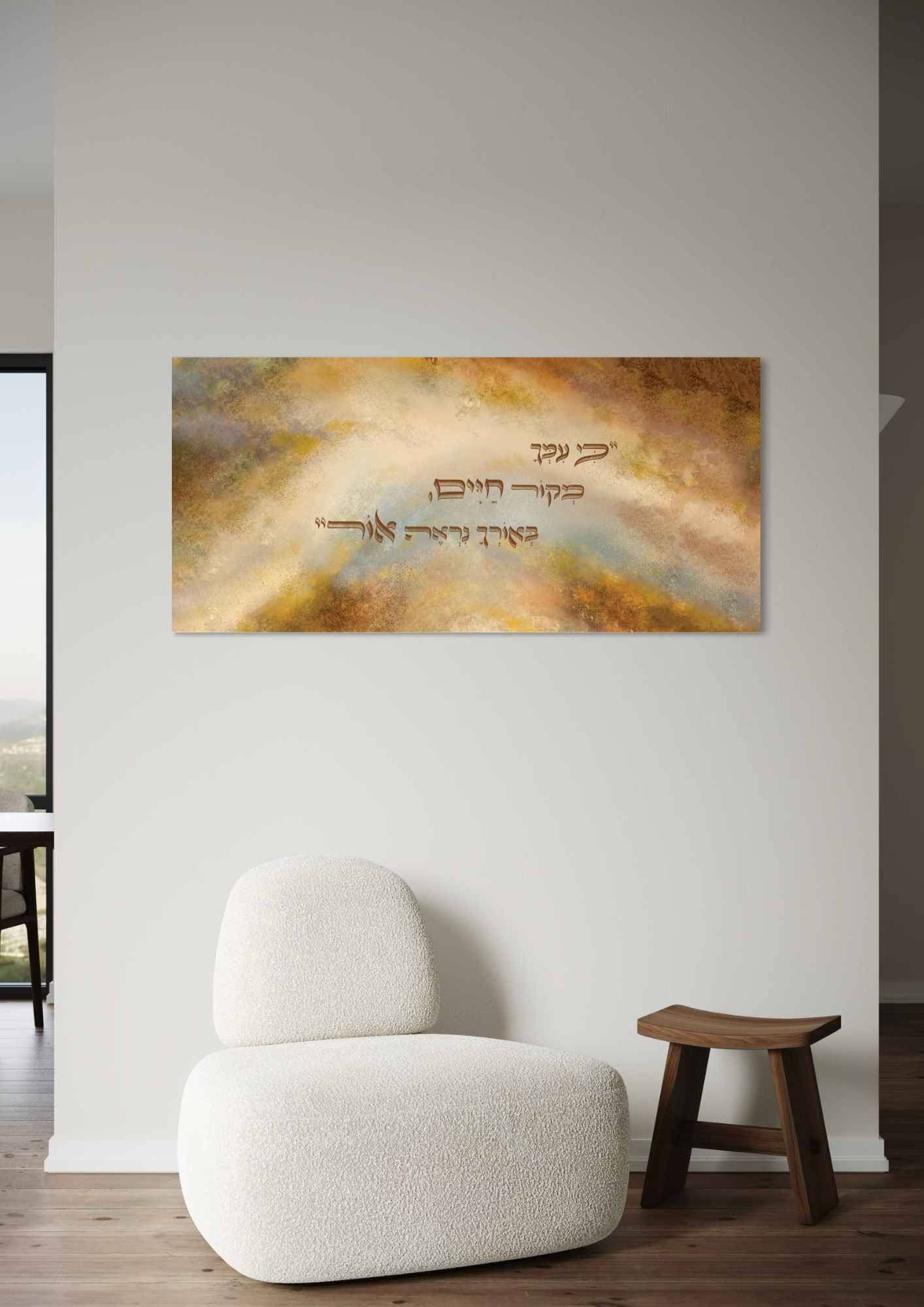 ציור מופשט בסגנון אבסטרקט בגווני אדמה, זהב ותכלת. הציור מבטא שביל מתפתל מעורפל, יחד עם הפסוק מתהילים (לו י): ״כִּי עִמְּךָ מְקוֹר חַיִּים בְּאוֹרְךָ נִרְאֶה אוֹר״