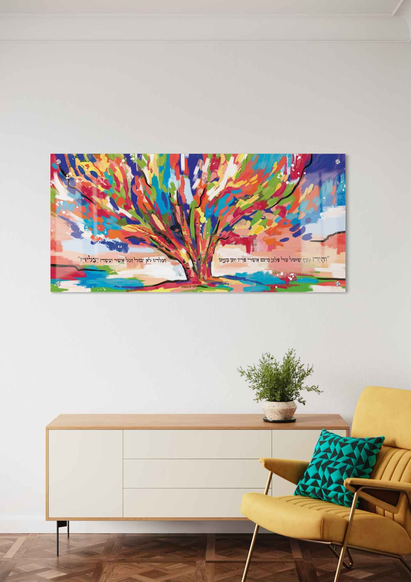 יצירה מלאת חיים ועוצמה של עץ המתפרש לכל הכיוונים, בצבעוניות עשירה ונועזת של גווני אדום, ירוק, טורקיז, צהוב, ורוד וסגול.