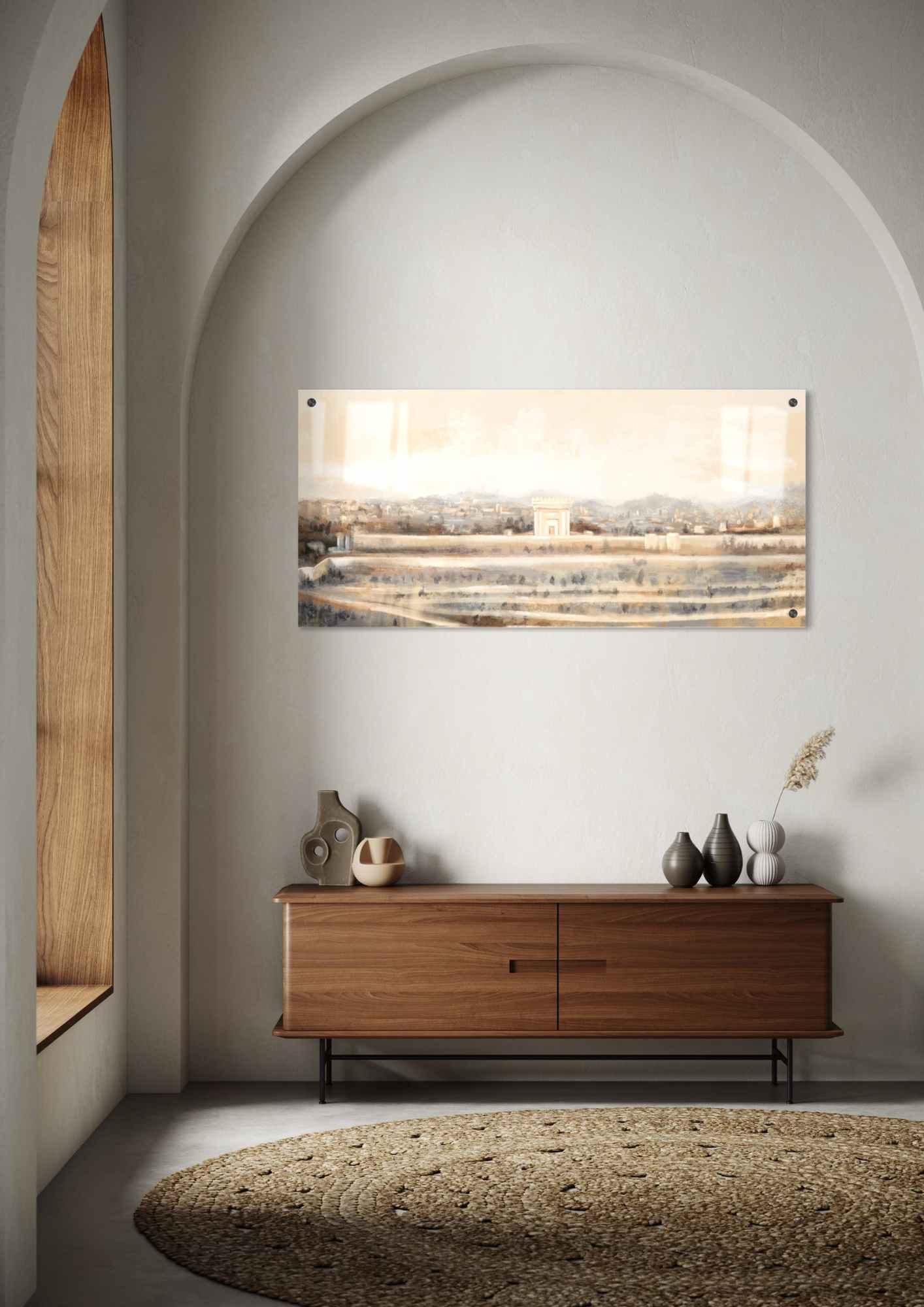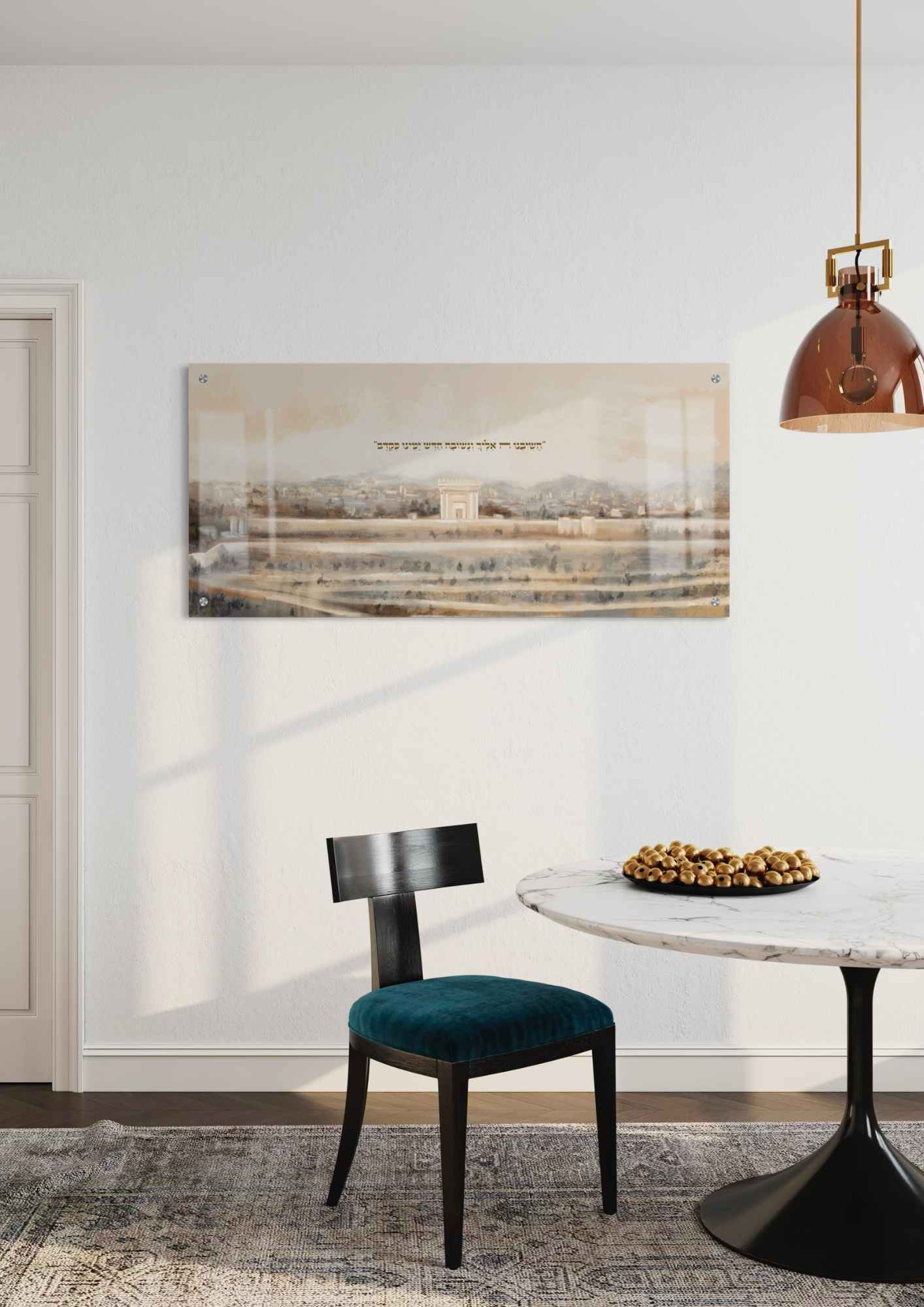 יצירה בהדפסה על זכוכית רחבה באווירה חמימה ובגווני בז׳, חום סהרה ואפור עדין, המתארת מבט אל ירושלים ובמרכזה בית המקדש.