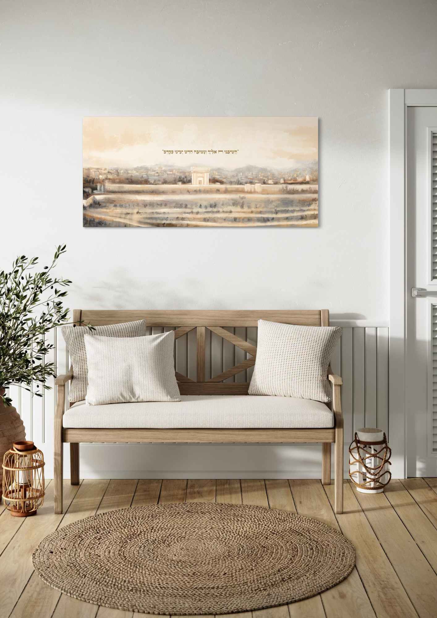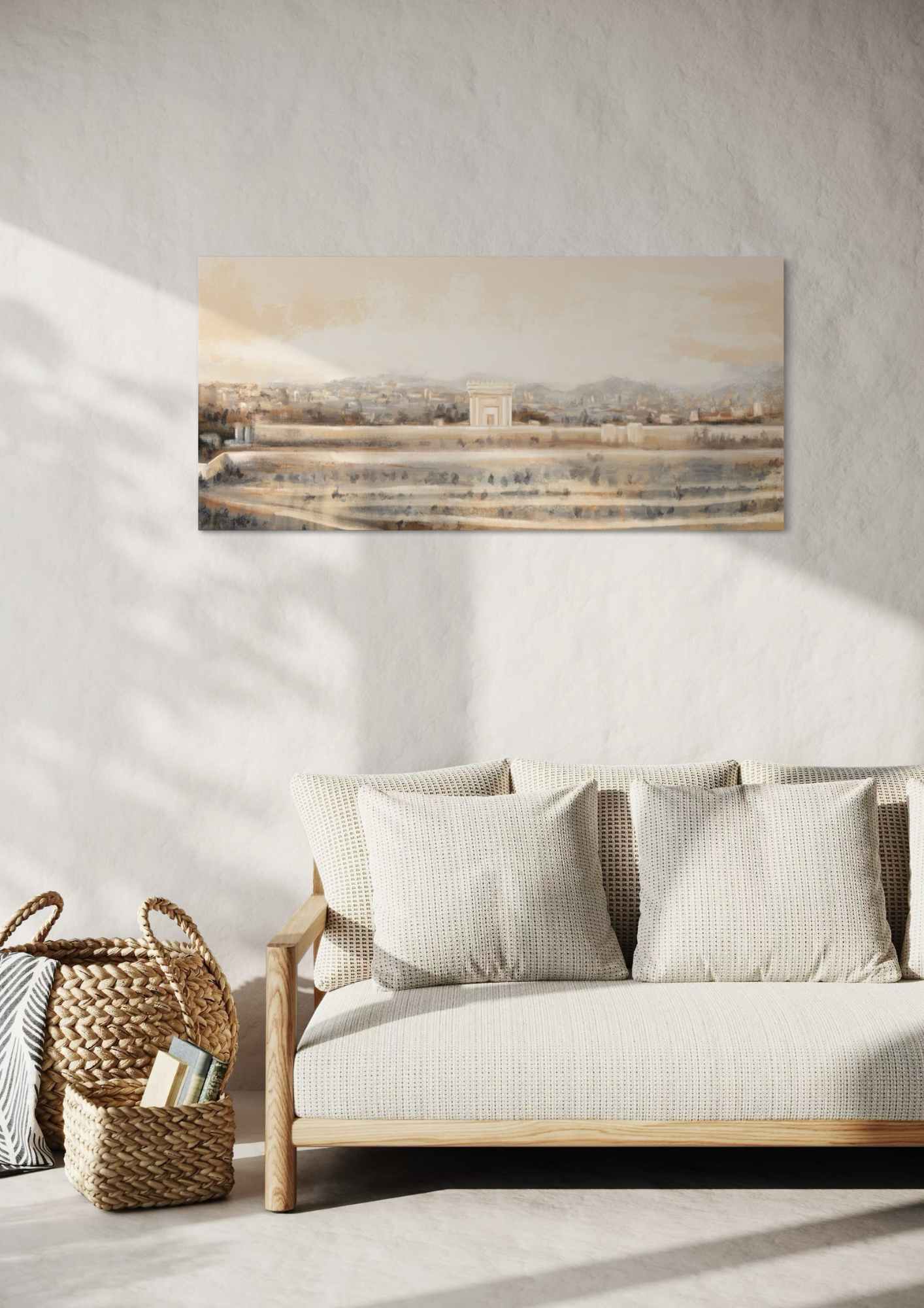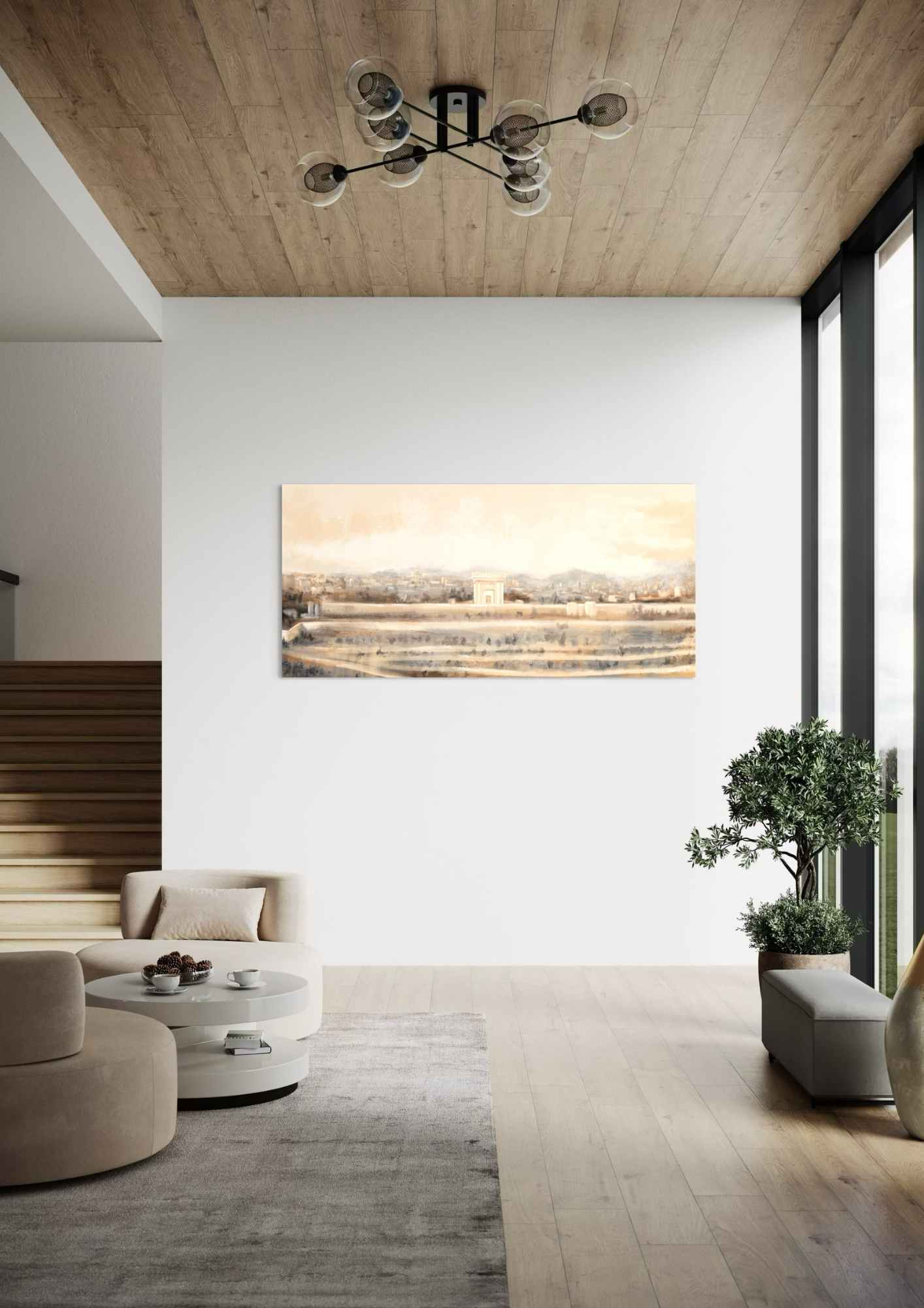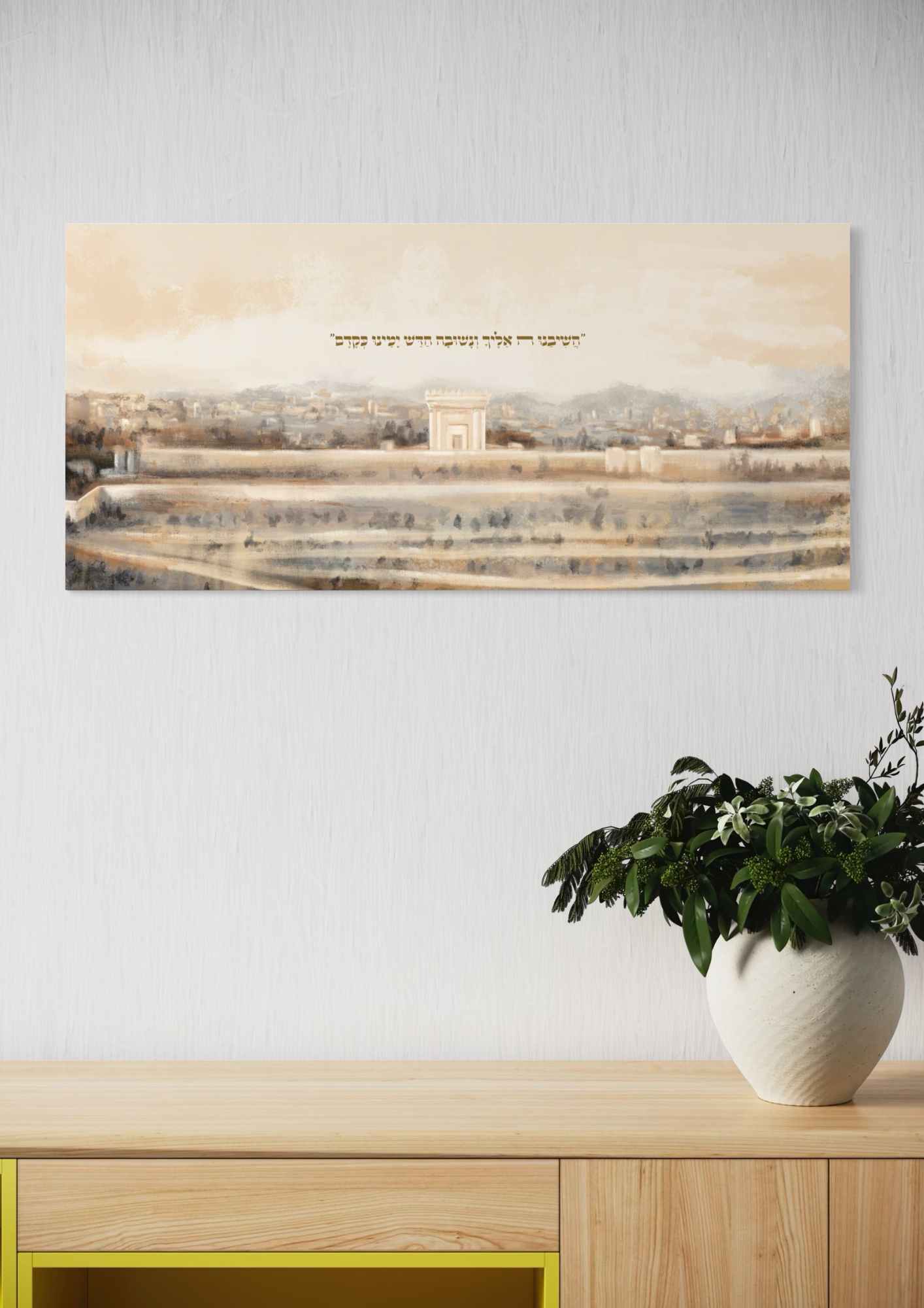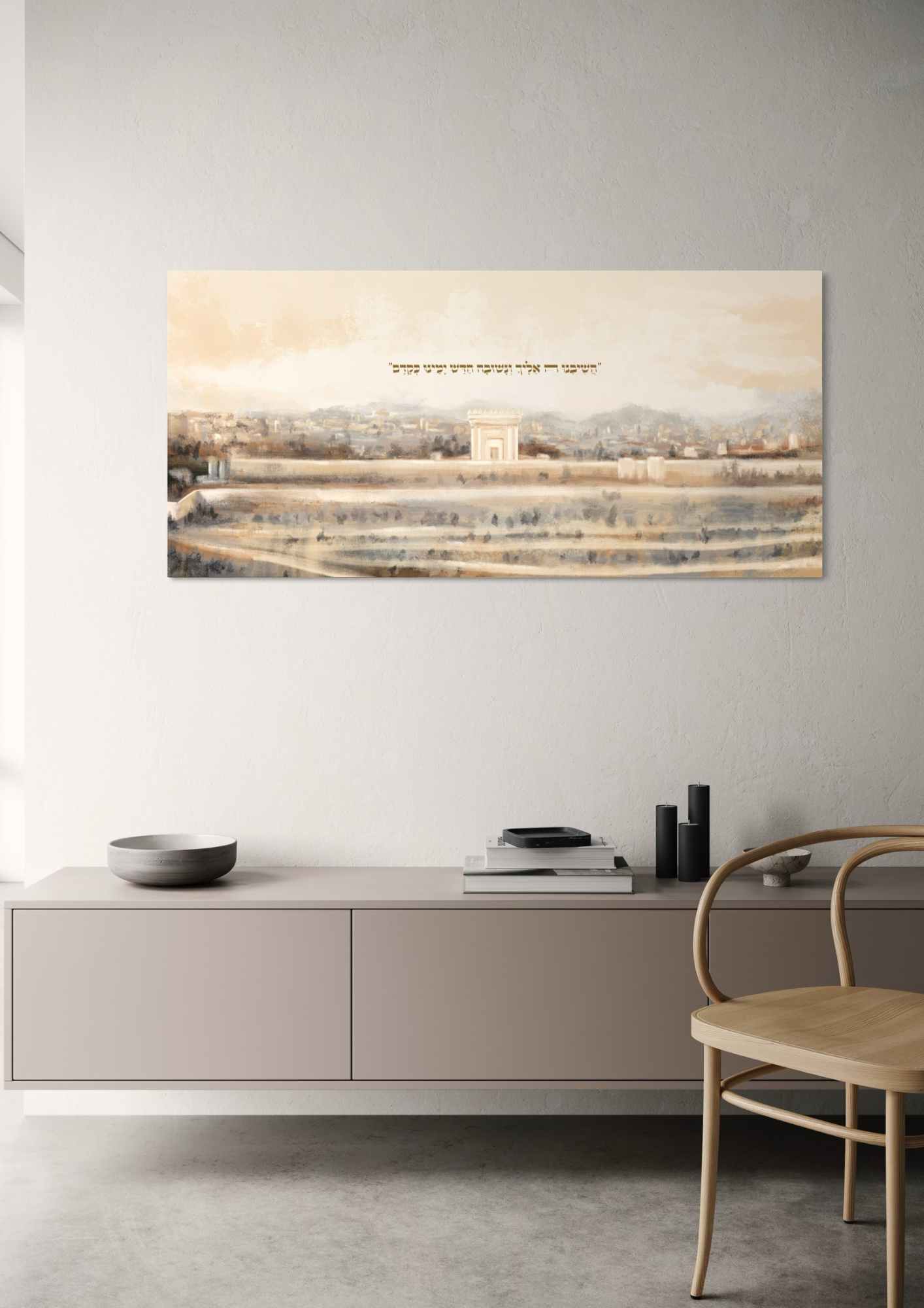 יצירת קנבס רחבה באווירה חמימה ובגווני בז׳, חום סהרה ואפור עדין, המתארת מבט אל ירושלים ובמרכזה בית המקדש.