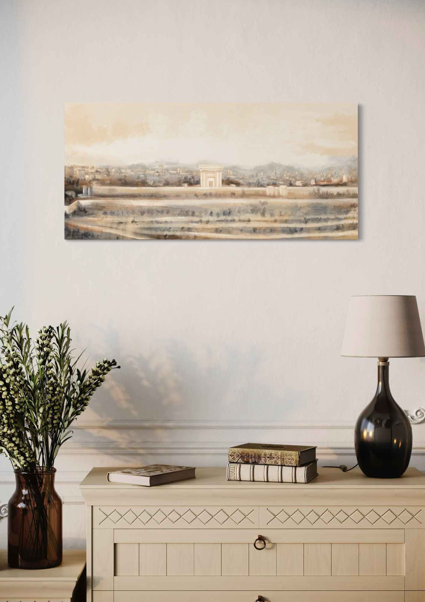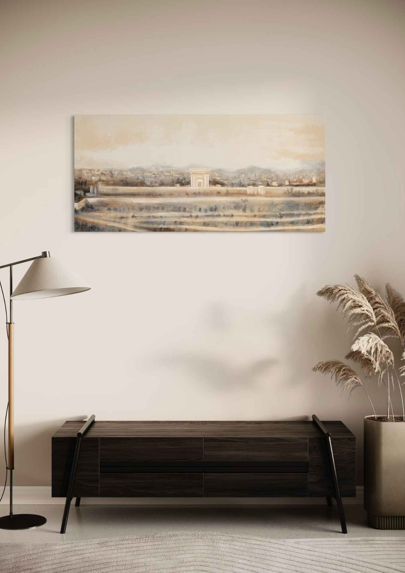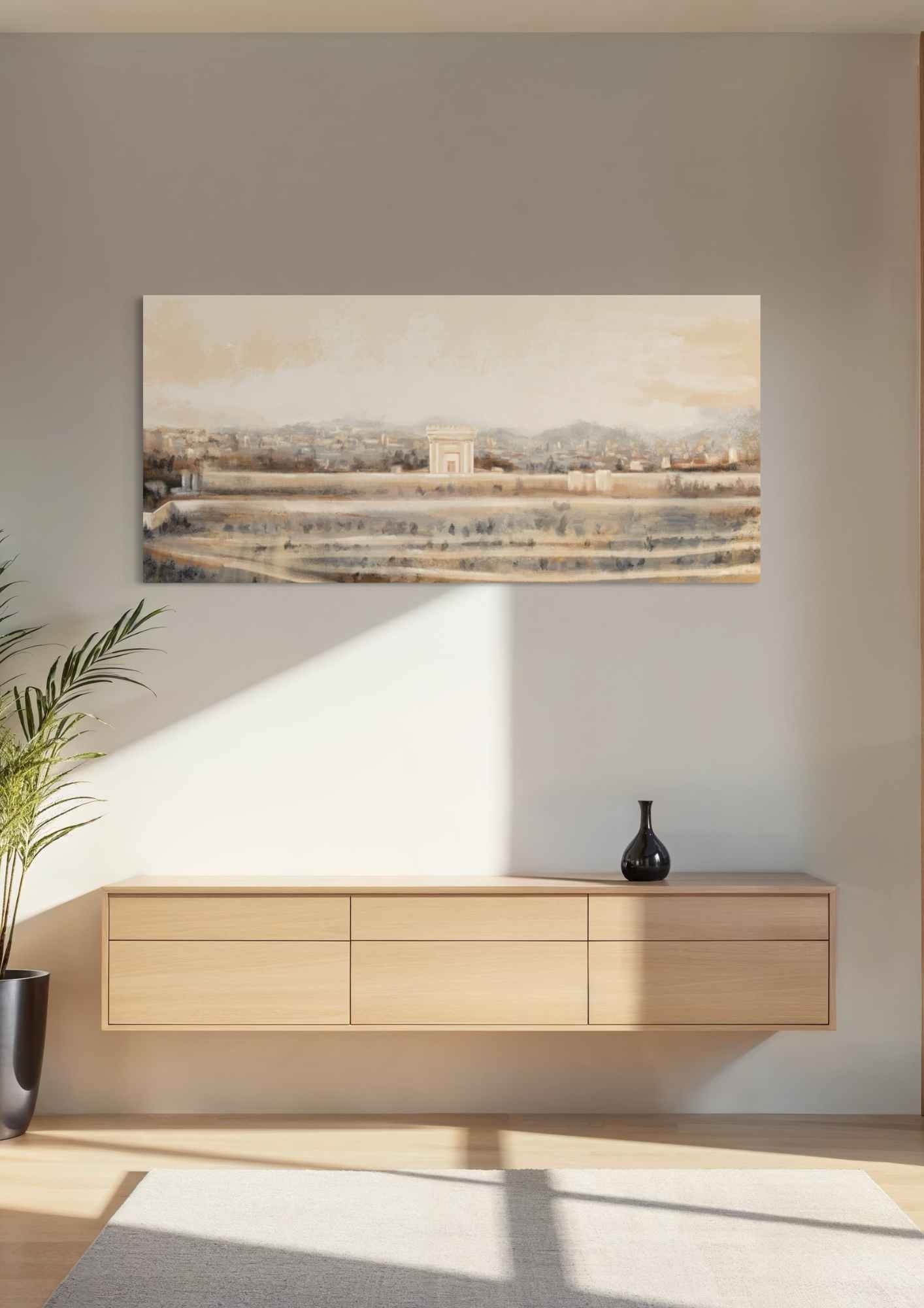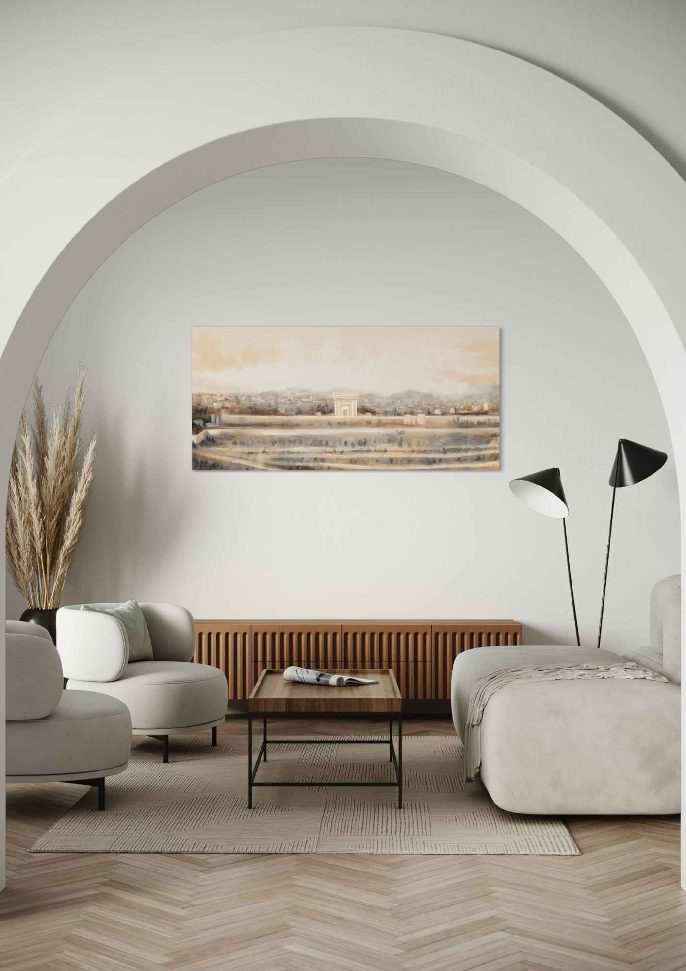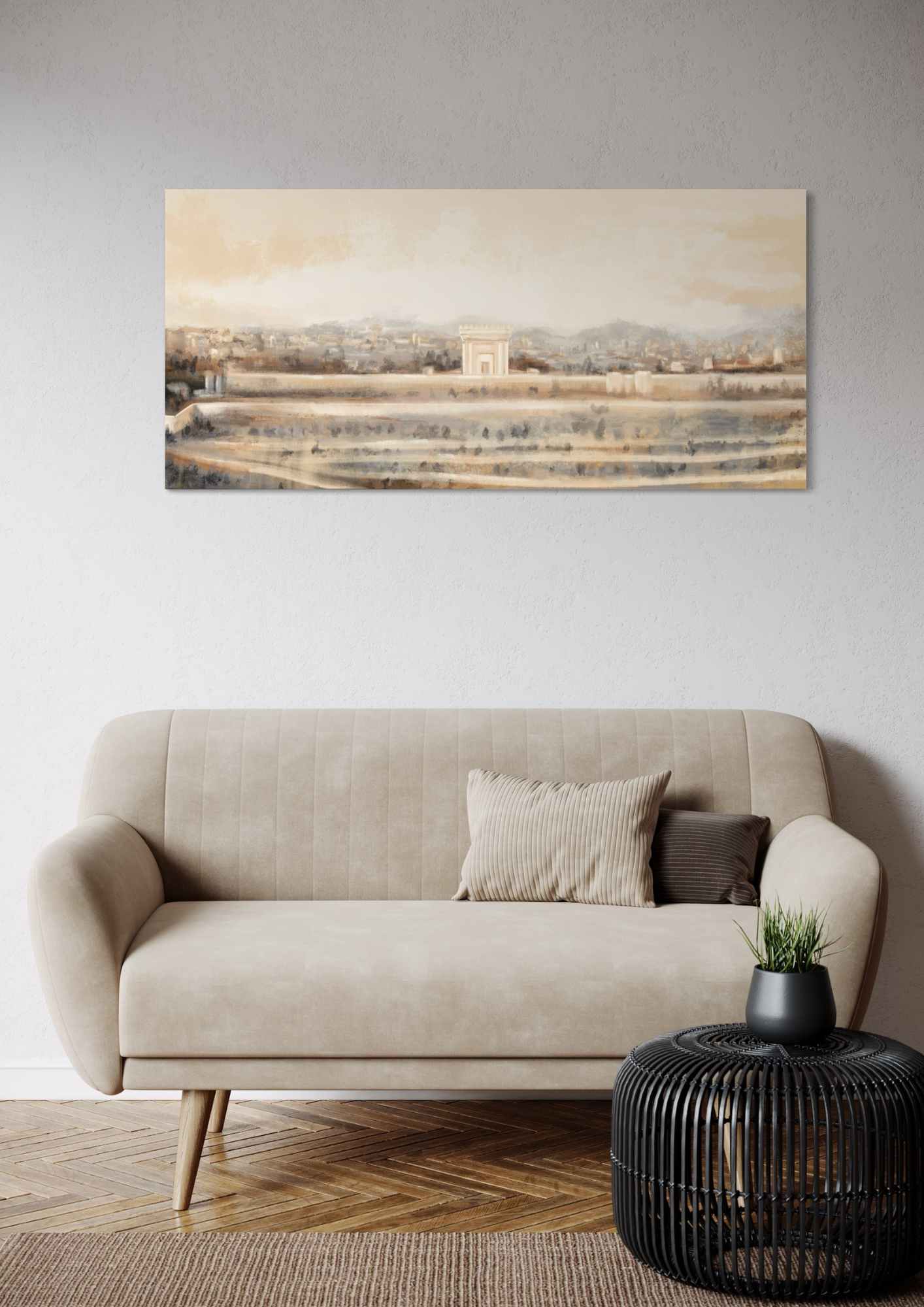יצירת קנבס רחבה באווירה חמימה ובגווני בז׳, חום סהרה ואפור עדין, המתארת מבט אל ירושלים ובמרכזה בית המקדש.