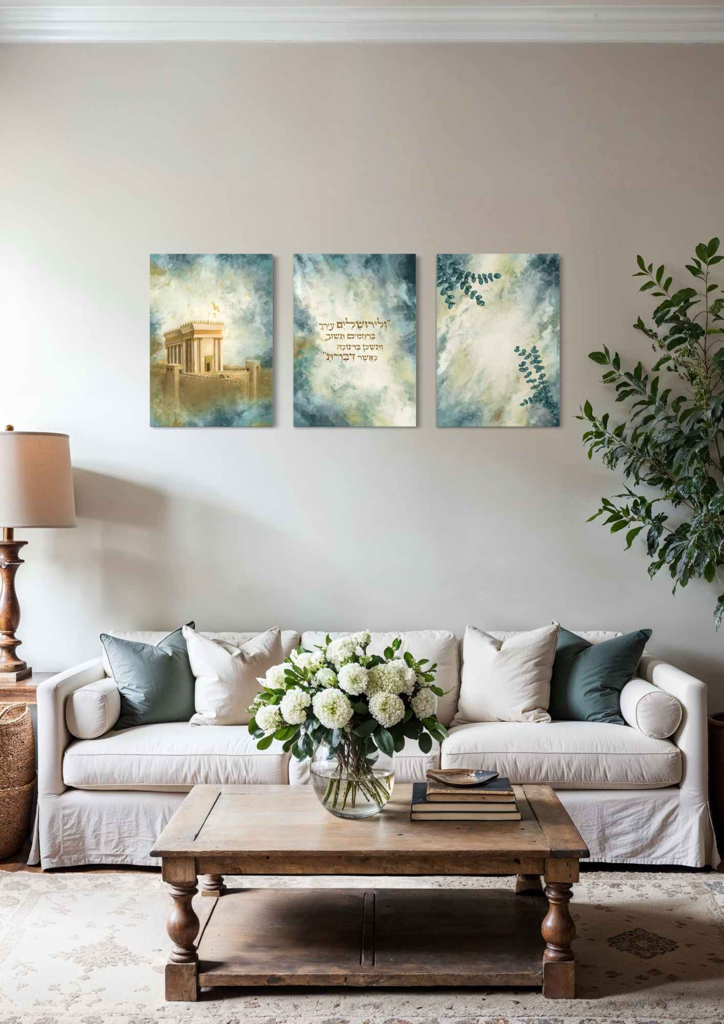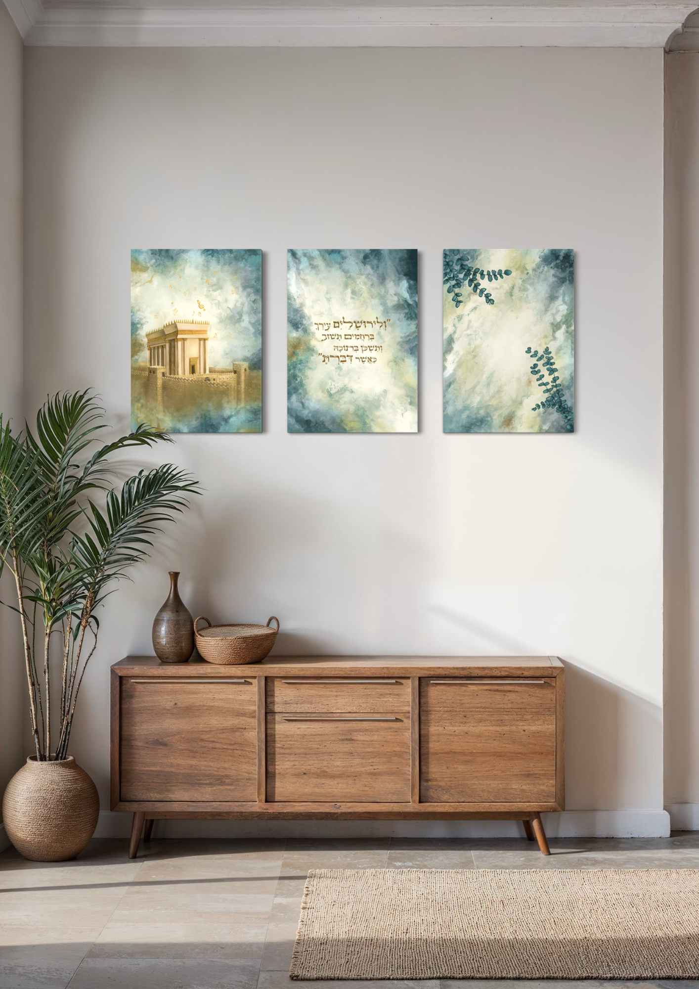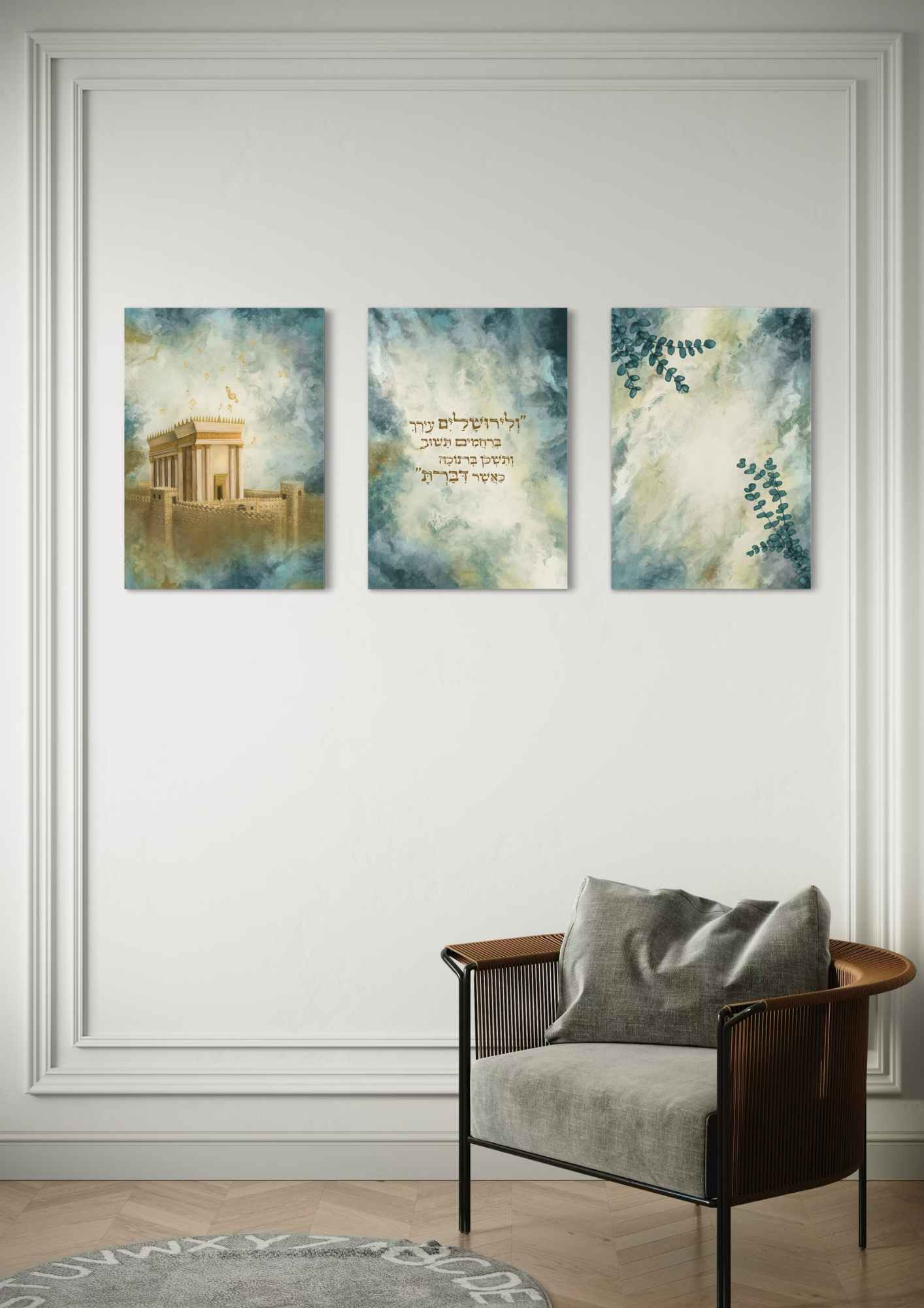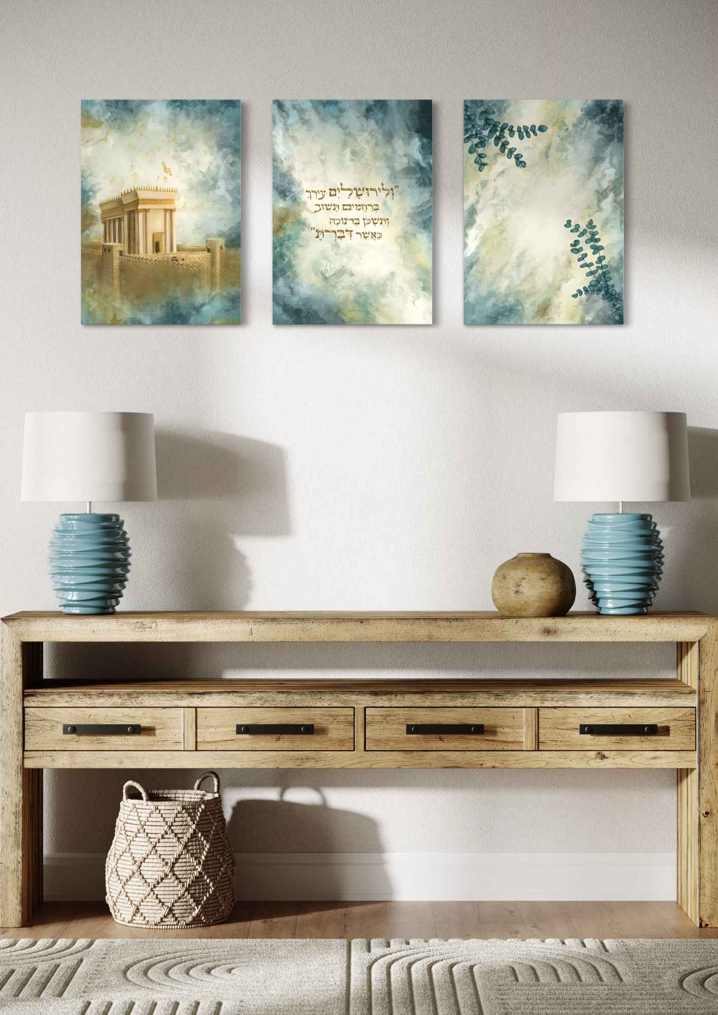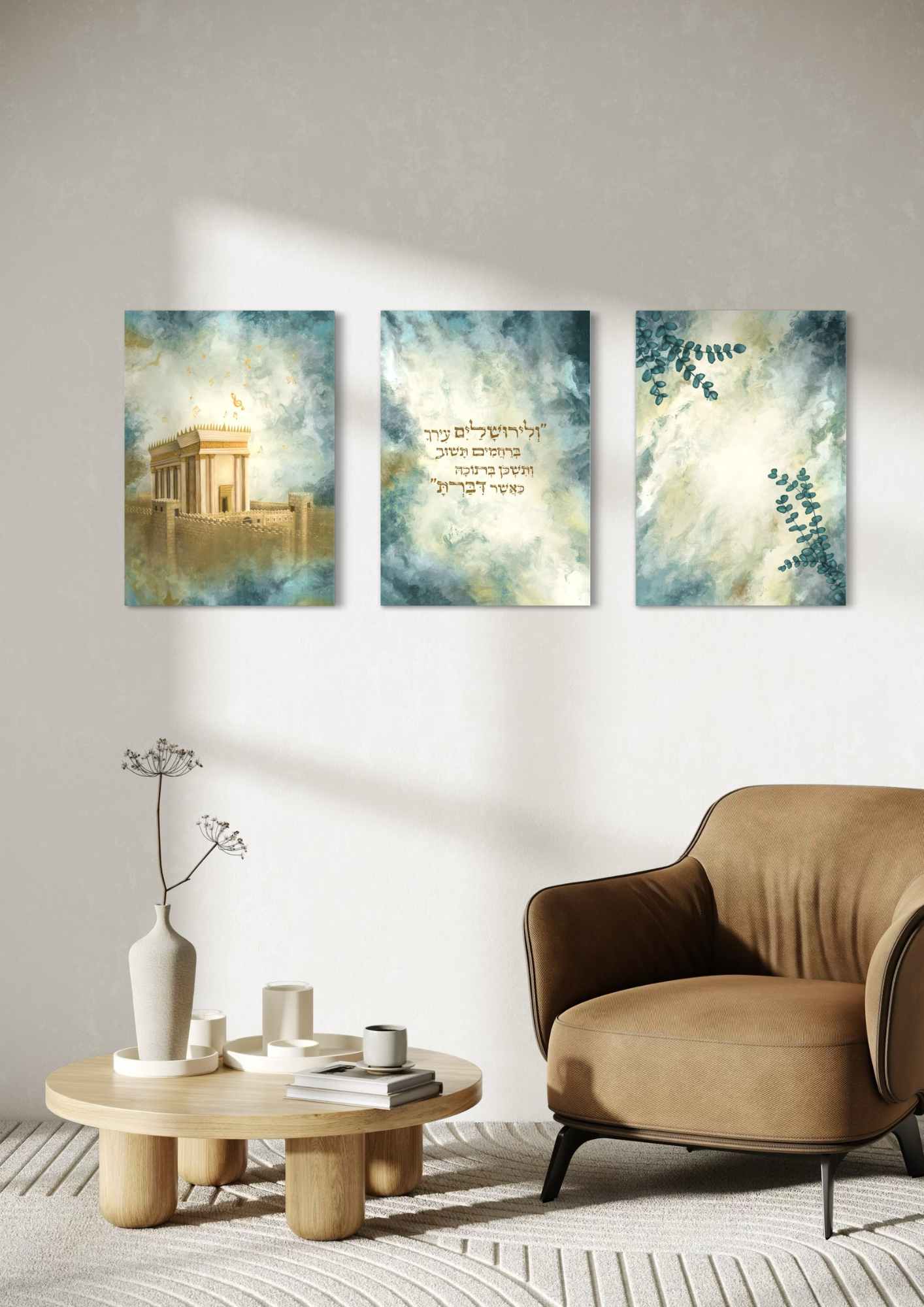 בצד השמאלי מתנוסס דימוי בית המקדש המואר באור זהוב, במרכז מופיע הפסוק מתפילת שמונה עשרה: