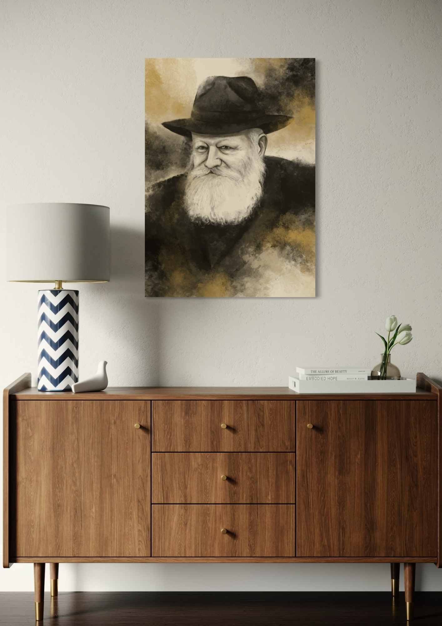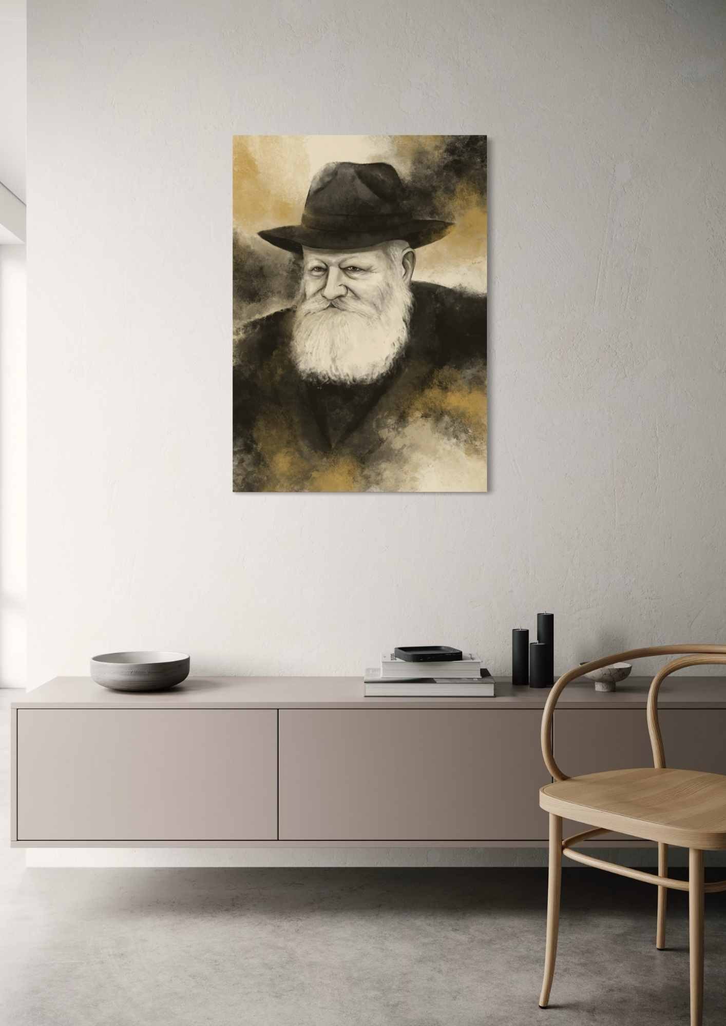 דיוקן אמנותי מרגש של הרבי מליובאוויטש, האדמו״ר האחרון של חסידות חב״ד, המשלב ריאליזם מדויק עם רקע מופשט עשיר בגווני שחור, סהרה וזהב.