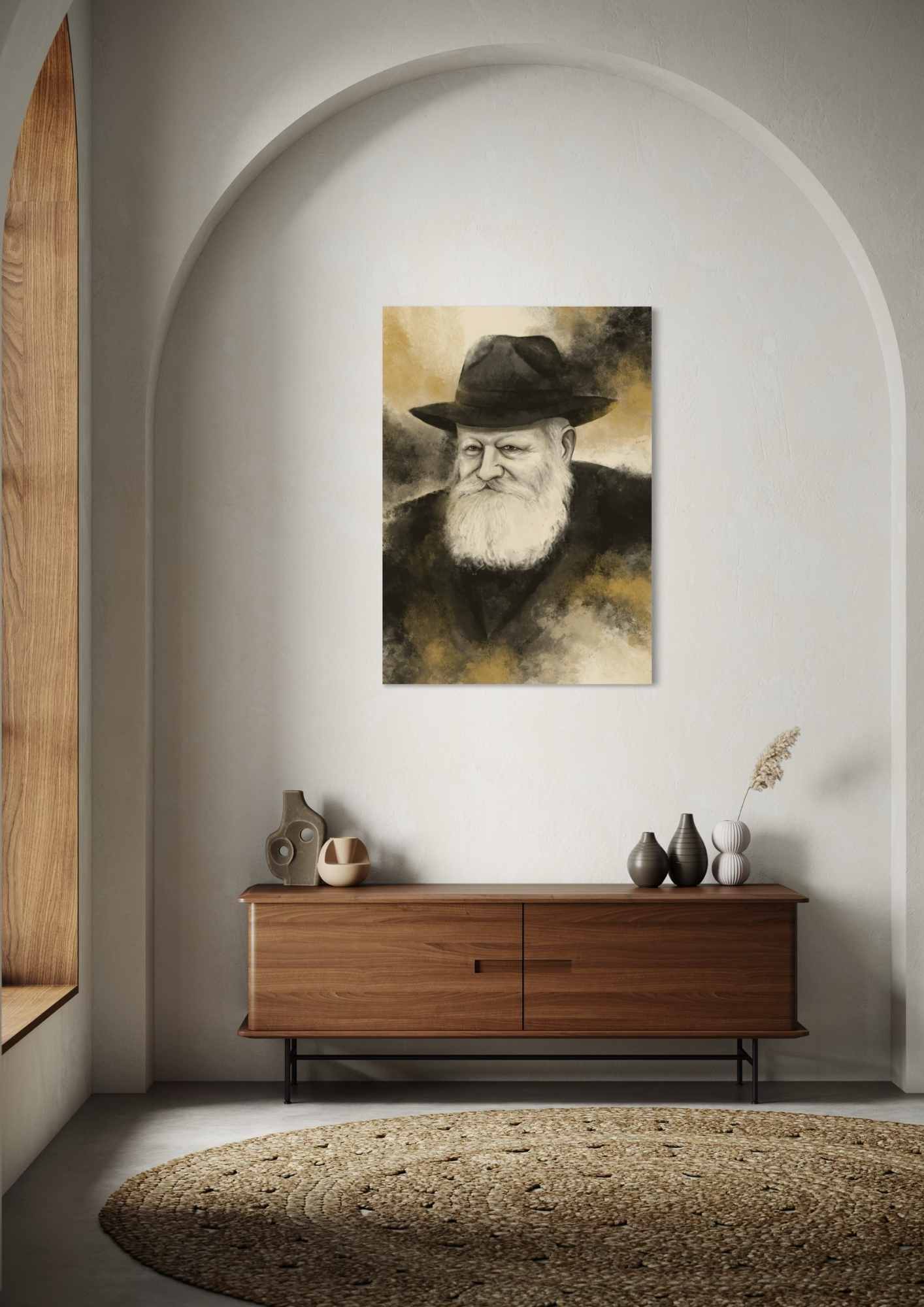 הרקע הציורי יוצר תחושת תנועה וריחוף, ומעצים את הדמות המרכזית מבלי להעמיס. שילוב הגוונים החמים והכהים מעניק ליצירה נוכחות שקטה אך עוצמתית, כזו שמלווה את החלל בתחושת השראה מתמשכת.